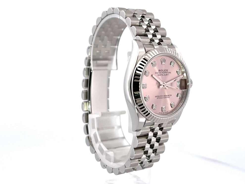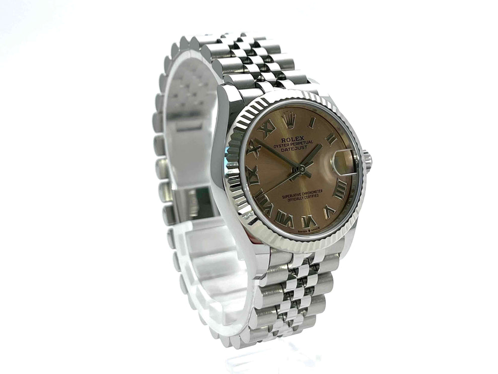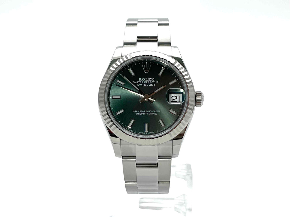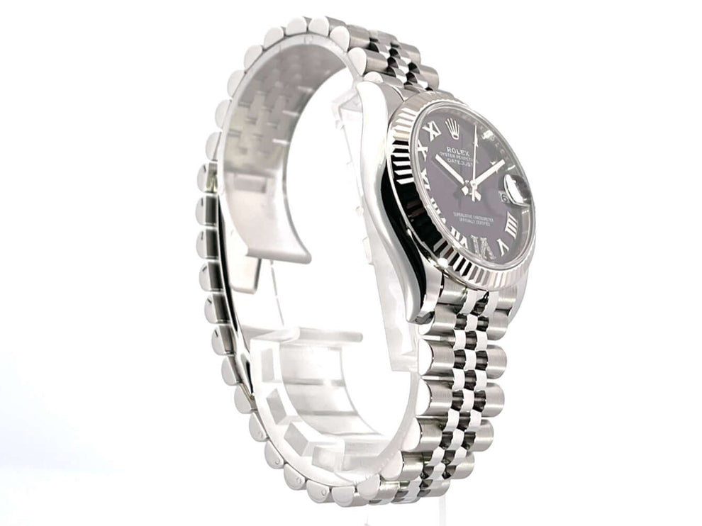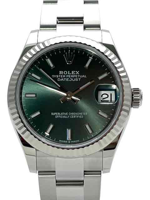 Die Rolex Datejust 31 Oystersteel / Weißgold der Referenz 278274 präsentiert sich dem Uhrenliebhaber mit Zifferblättern in verschiedenen Farbtönen. Eleganz strahlt die bemerkenswerte Uhr etwa mit einem dunklen, auberginefarbenen Zifferblatt aus. Eine kühle Zurückhaltung dagegen präsentiert die Datejust mit ihrem klar weiß lackierten Zifferblatt. Die beiden Farben Mintgrün und Dark Grey mit Radialschliff dagegen bilden einen eindrucksvollen Kontrast zu dem luxuriösen Weißgold von Gehäuse und Armband der Uhr. Die Referenz 278274 ist der Nachfolger der Referenz 178274. Liebhaber luxuriöser Uhren können diese Rolex mit zwei unterschiedlichen Armbändern kaufen.