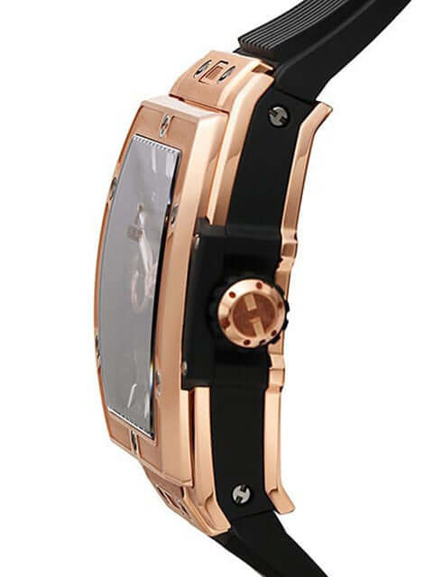 Neben der auffälligen Tonneau Form fällt einem noch ein Detail sofort ins Auge. Auf der Lünette befinden sich sechs kleine Schrauben. Alle wurden aus Titan hergestellt und haben das Aussehen eines kleinen H. Diese Schrauben sind das Markenzeichen von Hublot und dürfen natürlich auch bei der Spirit of Big Bang Reihe nicht fehlen. Ebenfalls typisch für Hublot ist die Verwendung verschiedenster Materialien, das sogenannte Fusionsprinzip, in nur einer Uhr.