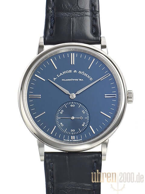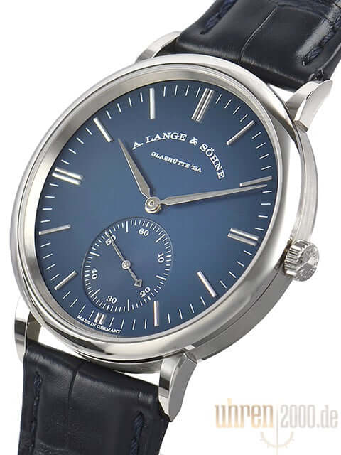 Case made of 18 kt white gold, case diameter 38.5 mm, case height 7.8 mm, polished 18 kt white gold bezel, blue alligator leather strap with 18 kt white gold pin buckle, blue dial, automatic, Lange manufacture caliber L086.1, vibration 21,600 A/h. , power reserve 72 hours, sapphire crystal, 18 kt white gold base with sapphire crystal, water resistant up to 3 bar.