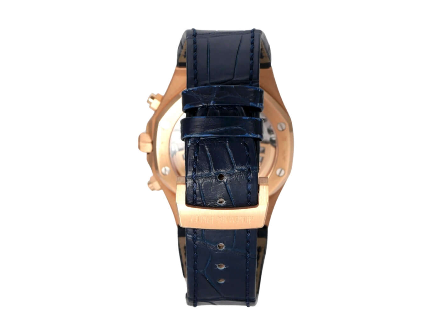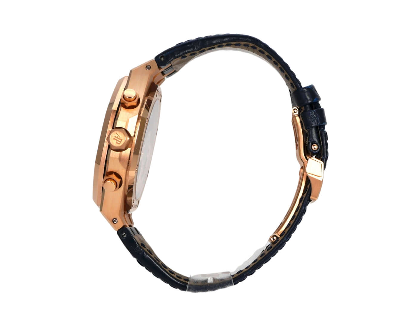 Gehäuse aus 18 kt Roségold poliert und satiniert, Gehäusedurchmesser 41 mm, Gehäusehöhe 11 mm, Roségold Lünette poliert und satiniert, blaues Lederband mit Faltschließe, blaues Zifferblatt mit Leuchtindizes, Leuchtzeiger, Totalisatoren Rosé, Automatikwerk, Manufakturkaliber 4401 mit 40 Steine, Schwingung 28.800 A/h, Gangreserve für ca. 70 Stunden, Datumsanzeige, entspiegeltes Saphirglas, 18 kt Roségoldboden verschraubt und graviert mit Sichtfenster, wasserdicht bis zu 5 bar.
