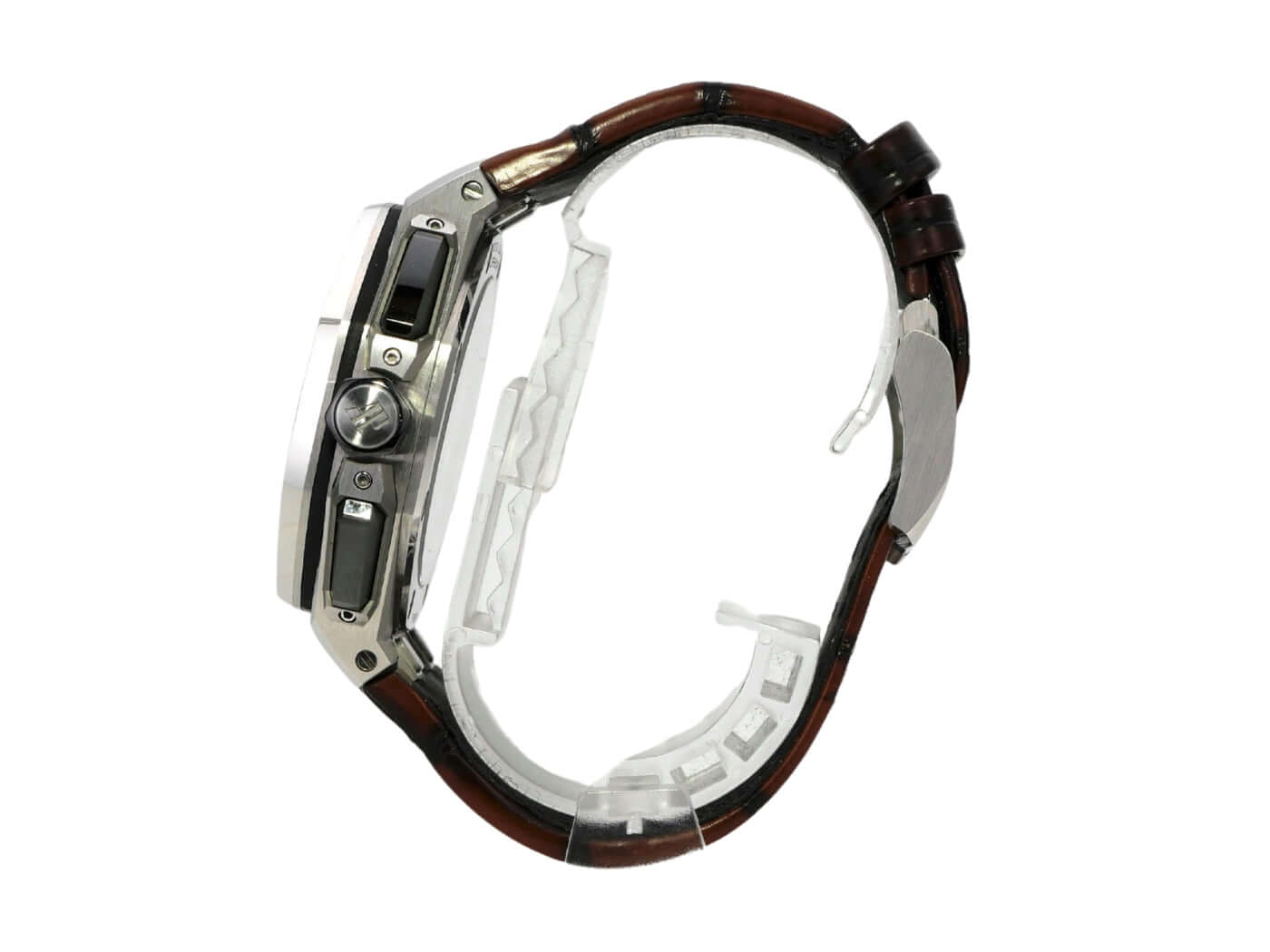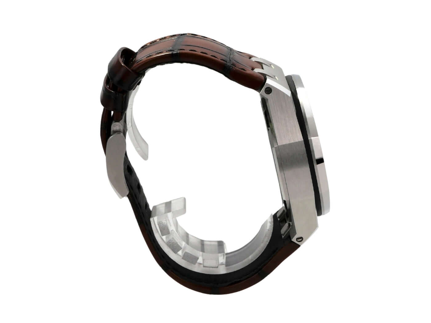 Case made of polished and satin-finished stainless steel, case diameter 43 mm, case height 14.4 mm, stainless steel bezel, brown leather strap with stainless steel pin buckle, additionally black rubber strap, smoky bronze-colored dial with white gold luminous indices, black subdials, tachymeter scale, automatic movement, manufacture caliber 4401 with 40 jewels, frequency 28,800 A/h, power reserve of approx. 70 hours, chronograph, date display, flyback function, anti-reflective sapphire crystal, screwed display back, water-resistant up to 10 bar.