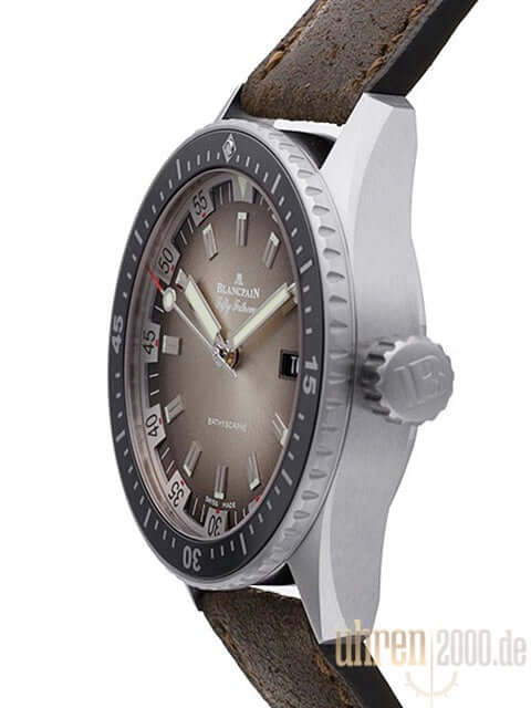 Case made of satinized stainless steel, case diameter 43 mm, stainless steel bezel with black ceramic inlay, rotatable with lock, brown leather strap with pin buckle, gray dial with applied luminous indices, luminous hands, second hand with luminous tip, automatic, caliber Blancpain 1315DD, 37 jewels, power reserve approx. 120 hours , date, day of the week, central seconds, sapphire crystal, screwed crown with side protection, screwed stainless steel back with viewing window, water resistant up to 30 bar, limited to 500 pieces.