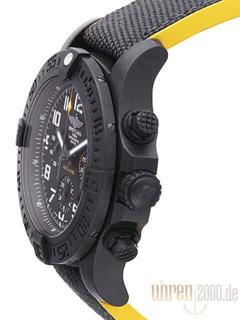Case made of Breitlight, case diameter 45 mm, case height 16.20 mm, Breitlight bezel can be rotated on one side, black dial with applied luminous numbers and luminous hands, yellow / black military rubber strap with folding clasp, automatic movement, chronograph, chronometer, manufacture caliber Breitling 01 with 47 jewels, 28,800 A/h, power reserve approx. 70 hours, date display, sapphire crystal with anti-reflective treatment on both sides, Breitlight back, water resistant up to 10 bar.