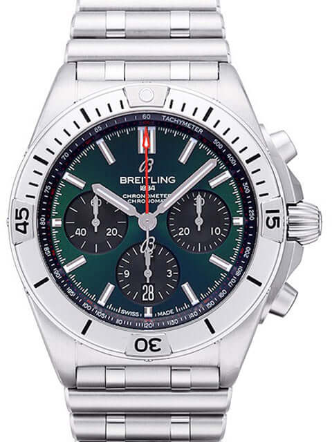 Case made of polished and satin-finished stainless steel, case diameter 42 mm, case height 15.10 mm, polished stainless steel bezel can be rotated on one side, stainless steel bracelet with folding clasp, green dial with luminous indices, luminous hands, black totalizers, automatic movement, manufacture caliber Breitling 01 with 47 jewels, 28,800 A/h , power reserve approx. 70 hours, date display, chronograph, chronometer, sapphire crystal with anti-reflective coating on both sides, stainless steel base with viewing window, water resistant up to 20 bar.