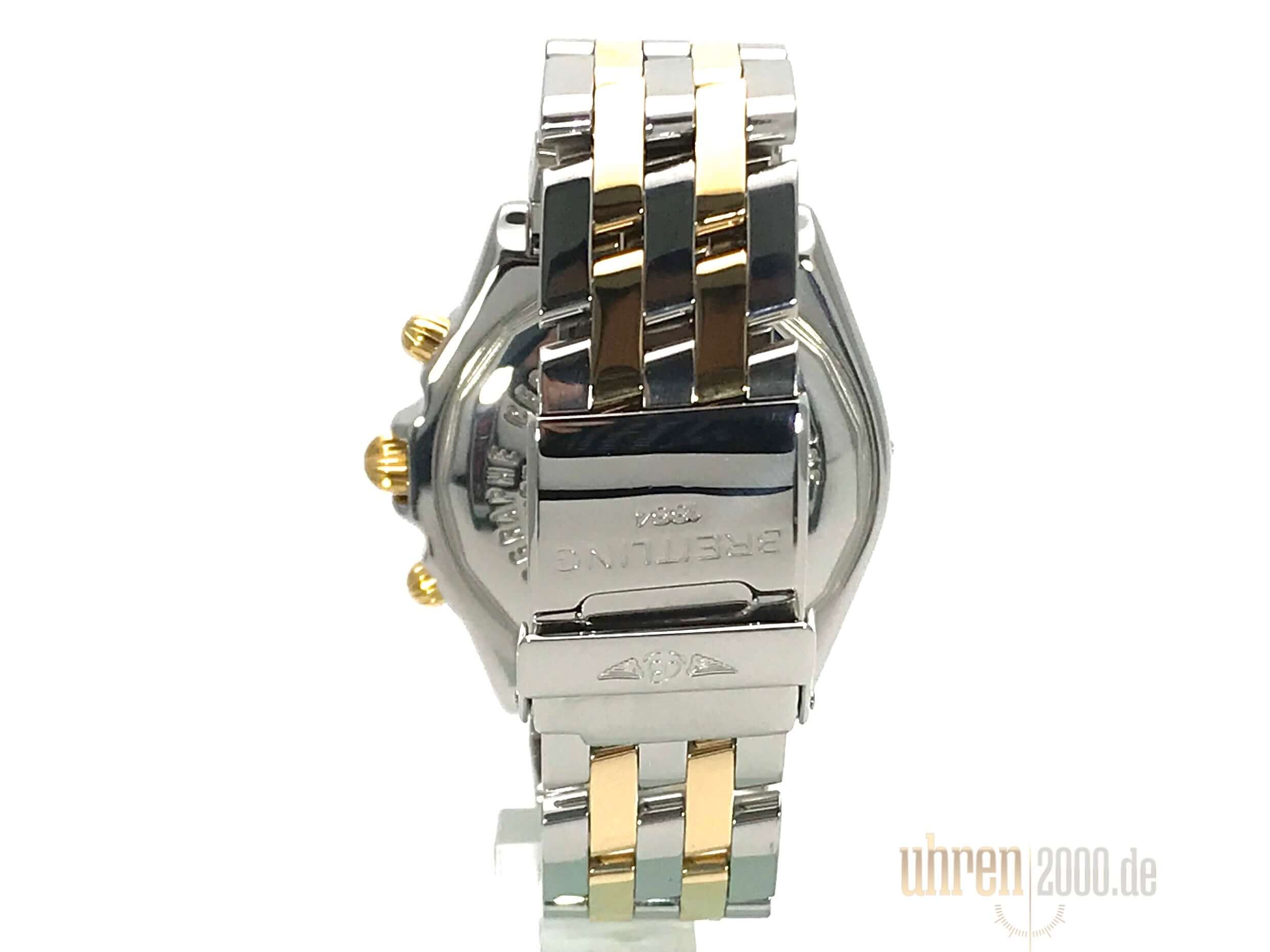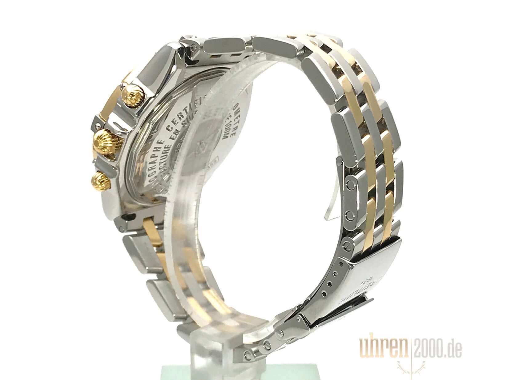Case made of polished stainless steel and yellow gold, case diameter 42.7 mm, case height 15.3 mm, polished stainless steel and yellow gold bezel, stainless steel and yellow gold bracelet with folding clasp, black dial with applied Roman numerals, luminous hands, automatic movement, chronometer, chronograph, Breitling 13, 28,800 A/h, power reserve approx. 42 hours, date display, sapphire crystal, screwed and engraved stainless steel back, water resistant up to 10 bar.