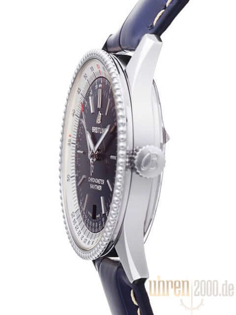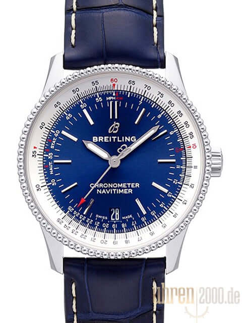 Case made of polished stainless steel, case diameter 38 mm, case height 10.1 mm, rotating stainless steel bezel with slide rule, blue dial with applied luminous indices, luminous hands, blue crocodile leather strap with folding clasp, automatic, Breitling caliber 17, 25 jewels, 28,800 A/h, power reserve approx 40 hours, date, chronometer, central seconds, sapphire crystal, screwed stainless steel back, water resistant up to 3 bar.