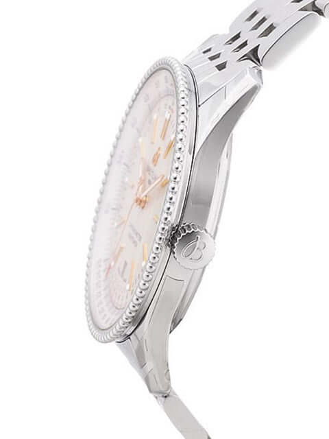 Case made of polished stainless steel, case diameter 41 mm, case height 10 mm, rotating stainless steel bezel with slide rule, silver-colored dial with applied luminous indices, luminous hands, stainless steel strap with folding clasp, automatic, Breitling caliber 17, 25 jewels, 28,800 A/h, power reserve approx. 40 hours , date, chronometer with certificate, central seconds, sapphire crystal, screwed stainless steel back, water resistant up to 3 bar.