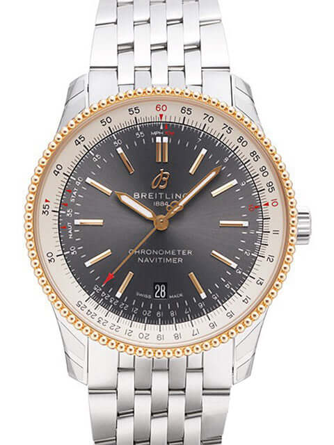 Case made of polished stainless steel, case diameter 41 mm, case height 10 mm, rotating red gold bezel with slide rule, stainless steel strap with folding clasp, gray dial with applied luminous indices, luminous hands, automatic, Breitling caliber 17, 25 jewels, 28,800 A/h, power reserve approx. 40 hours , date, chronometer, central seconds, sapphire crystal, screwed stainless steel back, water resistant up to 3 bar.