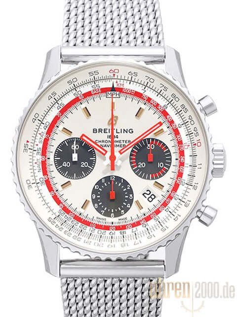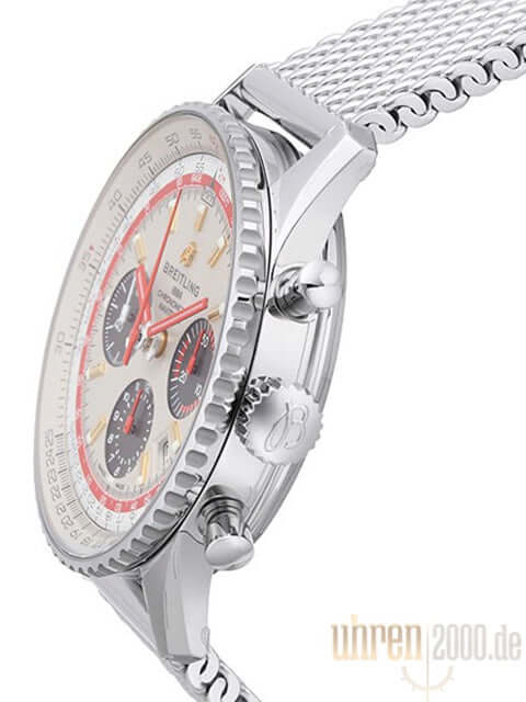 Case made of polished and satin-finished stainless steel, case diameter 43 mm, case height 14.25 mm, stainless steel bezel with wheels, rotatable slide rule, Ocean Classic stainless steel strap with folding clasp, silver-colored dial with applied indices, gray totalizers, red luminous hands, automatic movement, in-house caliber Breitling 01 with 47 jewels , 28,800 A/h, power reserve approx. 70 hours, date display, chronograph, chronometer, cambered sapphire crystal with anti-reflective coating on both sides, stainless steel back with sapphire crystal and printed TWA logo, water resistant up to 3 bar.