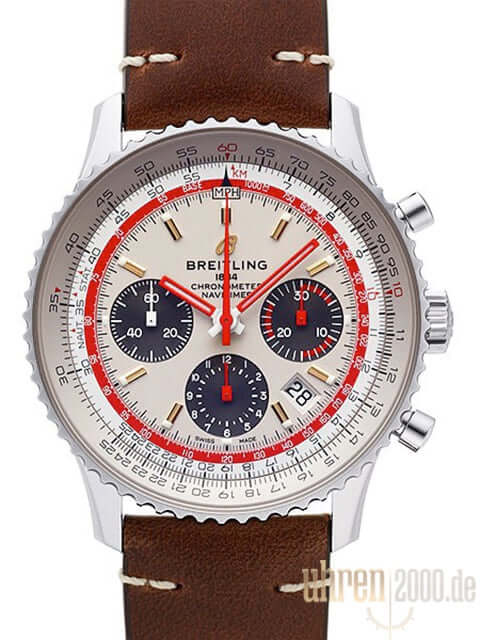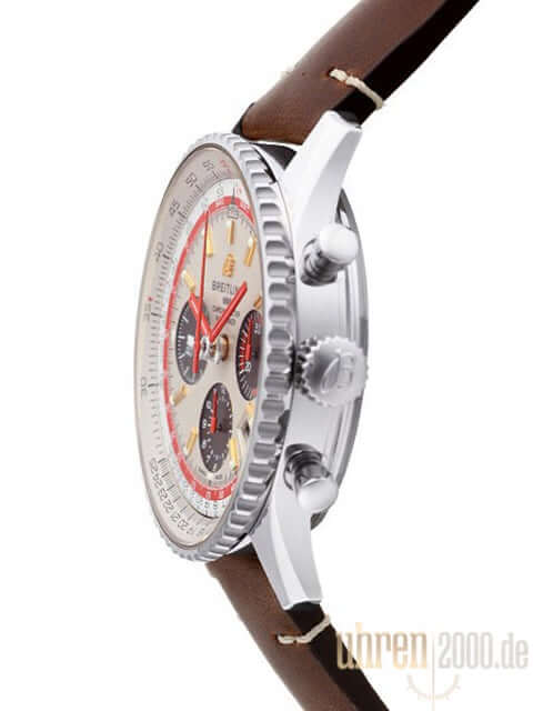 Case made of polished and satin-finished stainless steel, case diameter 43 mm, case height 14.25 mm, stainless steel bezel with wheels, rotatable slide rule, brown nubuck leather with folding clasp, silver-colored dial with applied indices, gray totalizers, red luminous hands, automatic movement, manufacture caliber Breitling 01 with 47 jewels, 28,800 A/h, power reserve approx. 70 hours, date display, chronograph, chronometer, cambered sapphire crystal with anti-reflective treatment on both sides, stainless steel back with sapphire crystal and printed TWA logo, water resistant up to 3 bar.