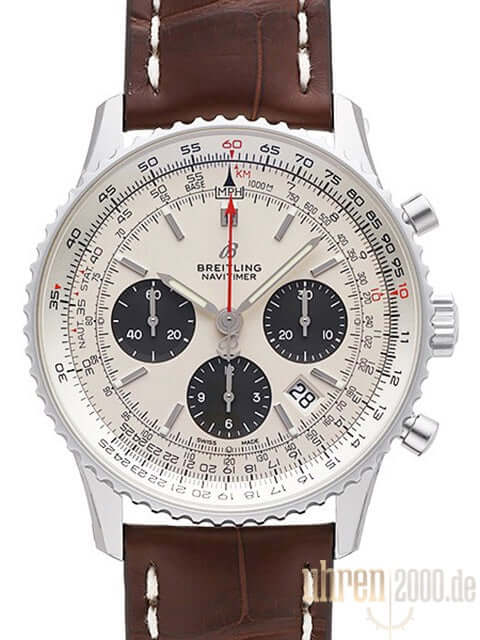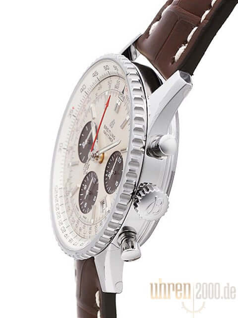 Case made of polished and satin-finished stainless steel, case diameter 43 mm, case height 14.22 mm, bezel made of stainless steel, rotatable slide rule, brown crocodile leather with folding clasp, silver-colored dial with applied indices, black totalizers, luminous hands, automatic movement, manufacture caliber Breitling 01 with 47 jewels, 28,800 A/h, power reserve approx. 70 hours, chronograph, date display, chronometer, cambered sapphire crystal with anti-reflective coating on both sides, screwed stainless steel base, engraved with viewing window, water resistant up to 3 bar.