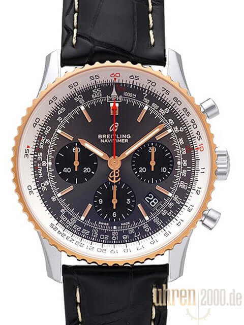 Case made of polished and satin-finished stainless steel, case diameter 43 mm, case height 14.22 mm, red gold bezel with wheels, rotatable slide rule, black crocodile leather strap with folding clasp, gray dial with applied red gold indices, black totalizers, luminous hands, automatic movement, in-house caliber Breitling 01 with 47 jewels , 28,800 A/h, power reserve approx. 70 hours, chronograph, date display, chronometer, cambered sapphire crystal with anti-reflective treatment on both sides, screwed stainless steel back, engraved with viewing window, water resistant up to 3 bar.