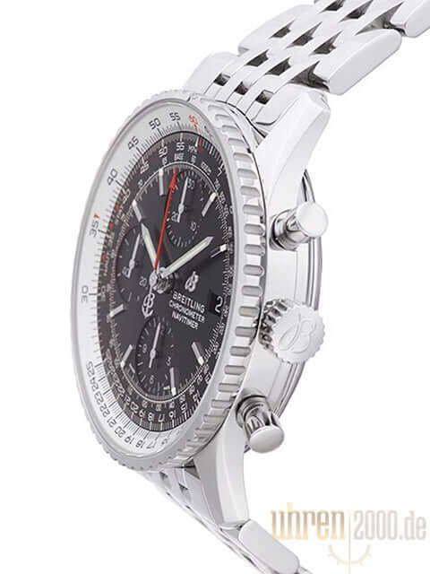 Case made of polished stainless steel, case diameter 41 mm, case height 14.44 mm, stainless steel bezel geared with slide rule, can be rotated on both sides, stainless steel strap with folding clasp, black dial with applied luminous indices, luminous hands, automatic movement, Breitling 13 with 25 jewels, 28,800 A/h, power reserve approx. 42 hours, date display, chronometer with certificate, sapphire crystal with anti-reflective coating on both sides, screwed and engraved stainless steel back, water resistant up to 3 bar.