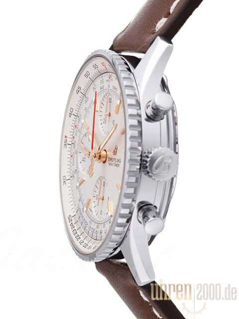 Case made of polished stainless steel, case diameter 41 mm, case height 14.44 mm, stainless steel bezel with slide rule, rotatable on both sides, silver-colored dial with applied luminous indices, luminous hands, brown leather strap with decorative stitching and folding clasp, automatic movement, Breitling 13 with 25 jewels, 28,800 A/ h, power reserve approx. 42 hours, date display, chronometer, sapphire crystal with anti-reflective treatment on both sides, screwed and engraved stainless steel back, water resistant up to 3 bar.