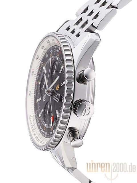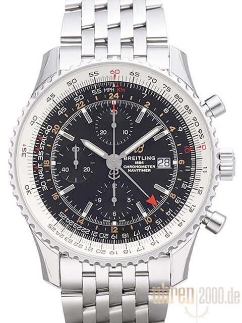 Case made of polished stainless steel, case diameter 46 mm, case height 15.5 mm, stainless steel bezel geared with slide rule, can be rotated on both sides, polished stainless steel strap with safety folding clasp, black dial with applied luminous indices, luminous hands, automatic movement, caliber Breitling 24, 25 jewels, 28,800 A/h , power reserve approx. 42 hours, date display at 3 o'clock, 24 hour display (second time zone), chronometer, sapphire crystal with anti-reflective coating on both sides, screwed and engraved stainless steel back, water resistant up to 3 bar.