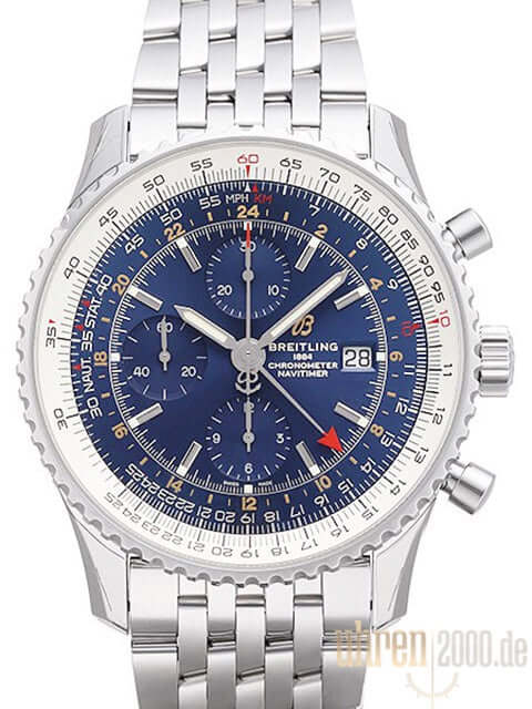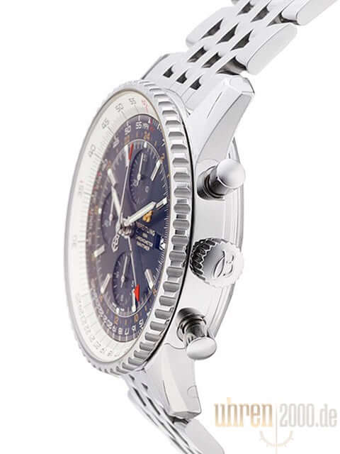 Case made of polished stainless steel, case diameter 46 mm, case height 15.5 mm, stainless steel bezel geared with slide rule, can be rotated on both sides, polished stainless steel strap with safety folding clasp, blue dial with applied luminous indices, luminous hands, automatic movement, caliber Breitling 24, 25 jewels, 28,800 A/h , power reserve approx. 42 hours, date display at 3 o'clock, 24 hour display (second time zone), chronometer, sapphire crystal with anti-reflective coating on both sides, screwed and engraved stainless steel back, water resistant up to 3 bar.
