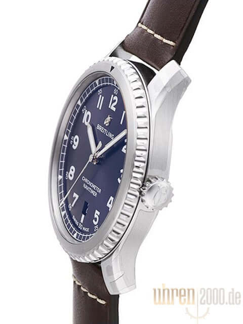 Case made of satin-finished stainless steel, case diameter 41 mm, case height 10.74 mm, rotating stainless steel bezel with slide rule, brown leather strap with pin buckle, blue dial with applied luminous indices, luminous hands, automatic movement, Breitling caliber 17, 25 jewels, 28,800 A/h, power reserve approx. 40 hours, date, chronometer, central seconds, sapphire crystal, screwed stainless steel base, water resistant up to 10 bar.
