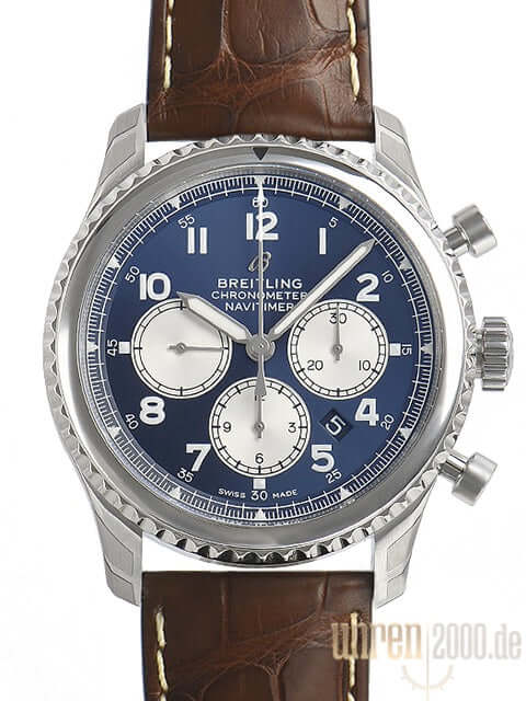 Case made of polished and satin-finished stainless steel, case diameter 43 mm, case height 13.97 mm, stainless steel bezel with wheels, brown crocodile leather with pin buckle, blue dial with applied Arabic numerals, silver-colored totalizers, luminous hands, automatic movement, manufacture caliber Breitling 01 with 47 jewels, 28,800 A/ h, power reserve approx. 70 hours, date display, chronometer, cambered sapphire crystal with anti-reflective coating on both sides, screwed stainless steel back, engraved with viewing window, water resistant up to 10 bar.