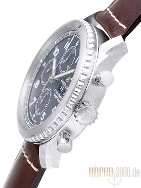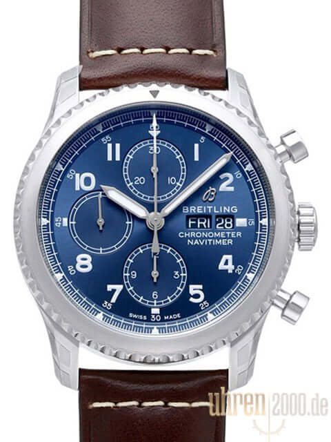 Case made of polished and satin-finished stainless steel, case diameter 43 mm, case height 14.17 mm, stainless steel bezel with wheels, blue leather strap with pin buckle, blue dial with applied Arabic numerals, luminous hands, automatic movement, Breitling 13 with 25 jewels, 28,800 A/h, power reserve approx 42 hours, date display, day of the week, chronometer, cambered sapphire crystal with anti-reflective coating on both sides, screwed stainless steel back, water resistant up to 10 bar.