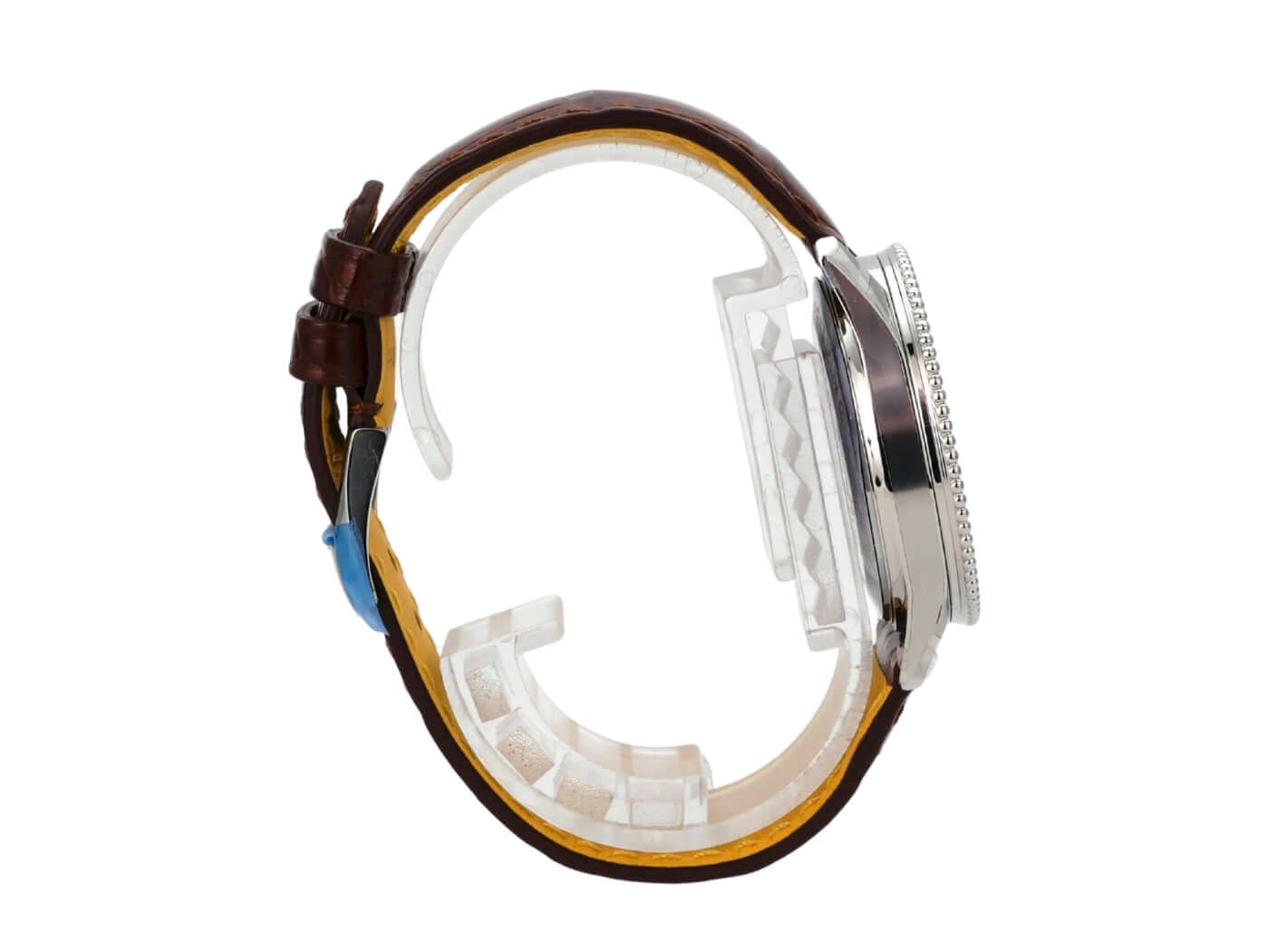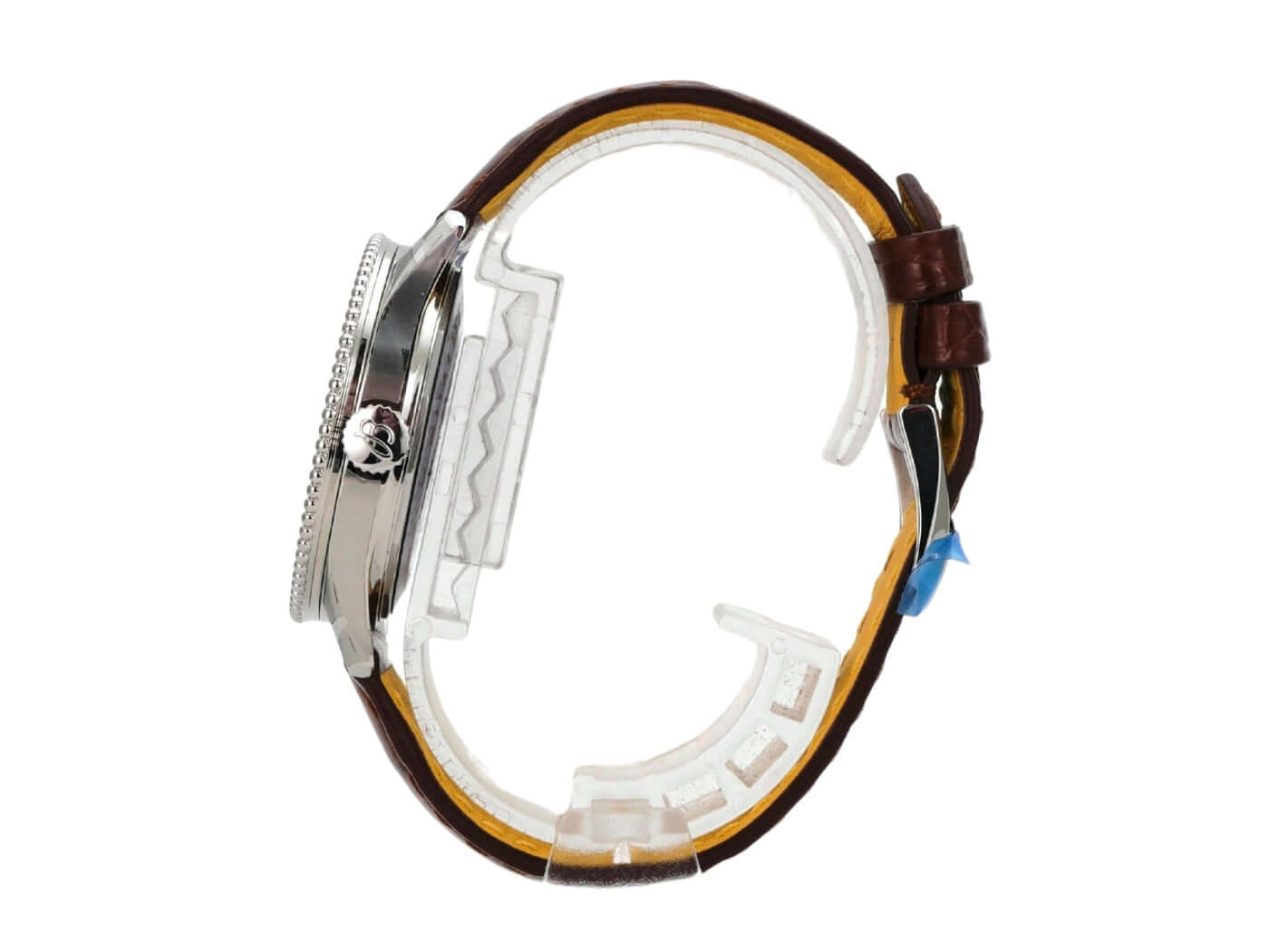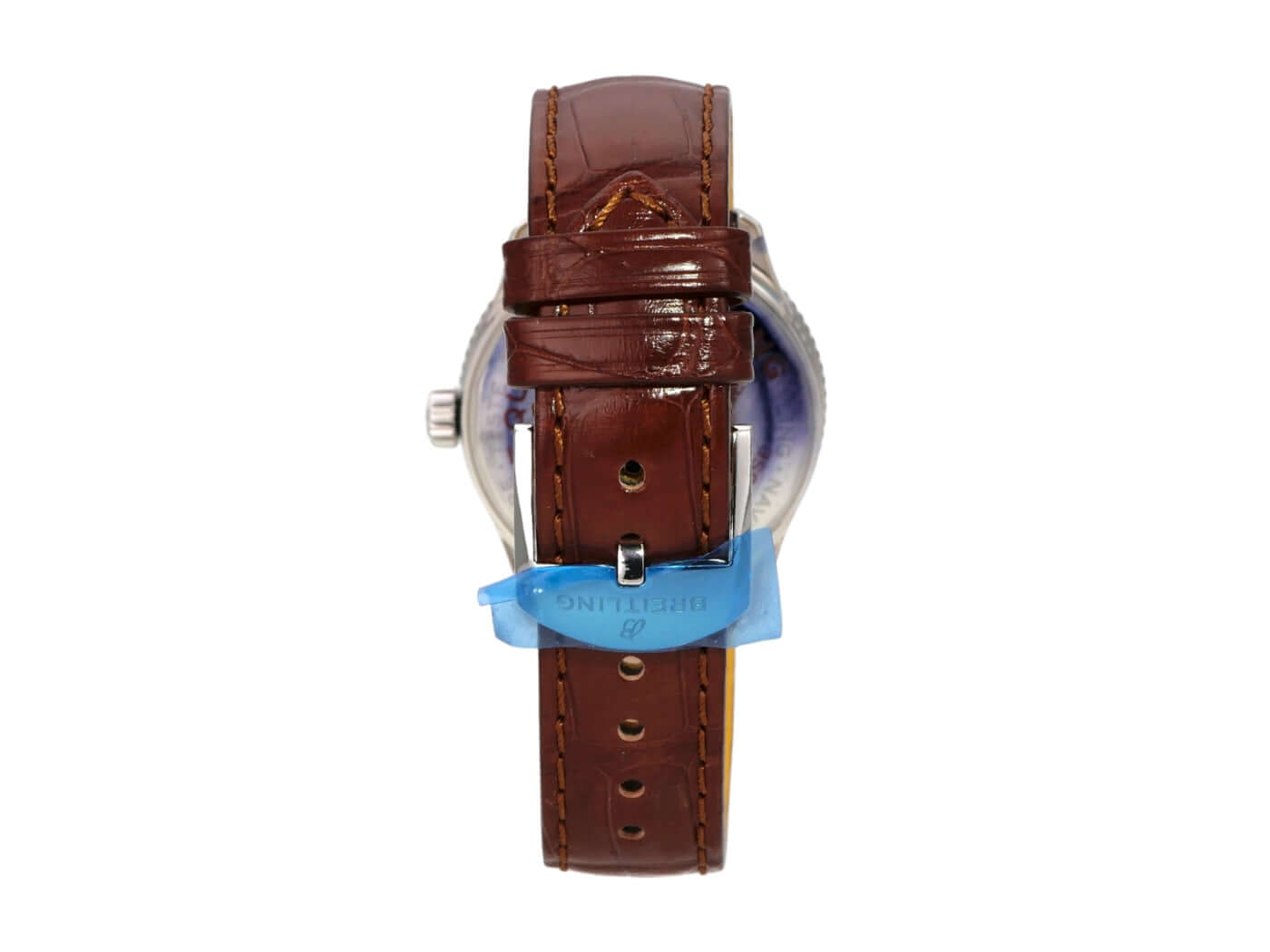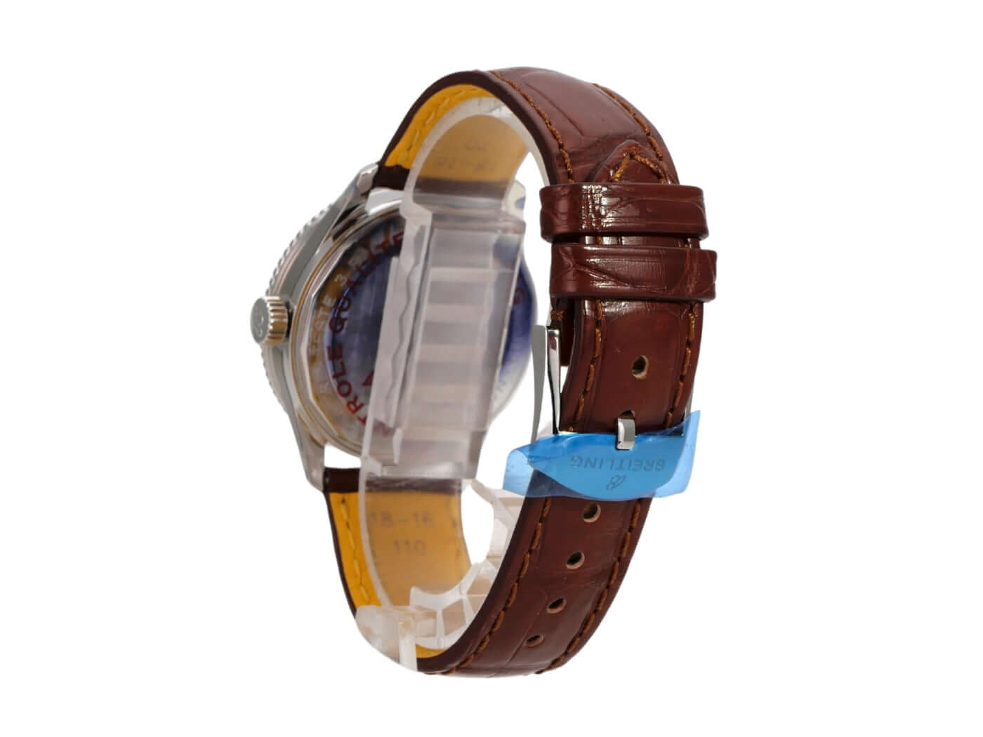 Polished stainless steel case, case diameter 35 mm, case height 9.92 mm, rotating stainless steel bezel with slide rule, brown crocodile leather strap with pin buckle, copper-colored dial with applied luminous indices, luminous hands, automatic, Breitling caliber 17, 25 jewels, 28,800 A/h, approximately 40 hours power reserve, date, chronometer, central seconds, sapphire crystal, screwed stainless steel case back, water-resistant up to 3 bar.
