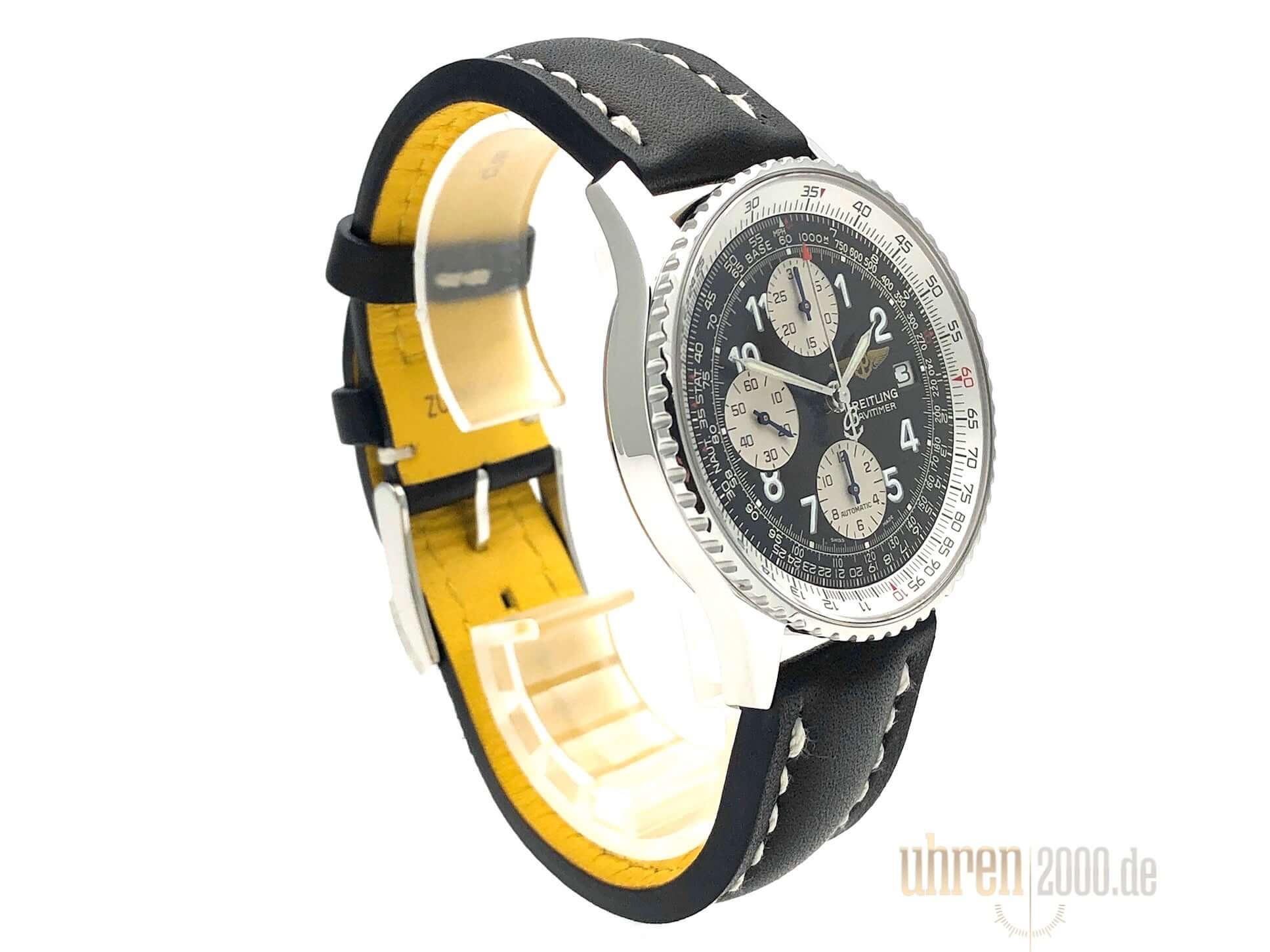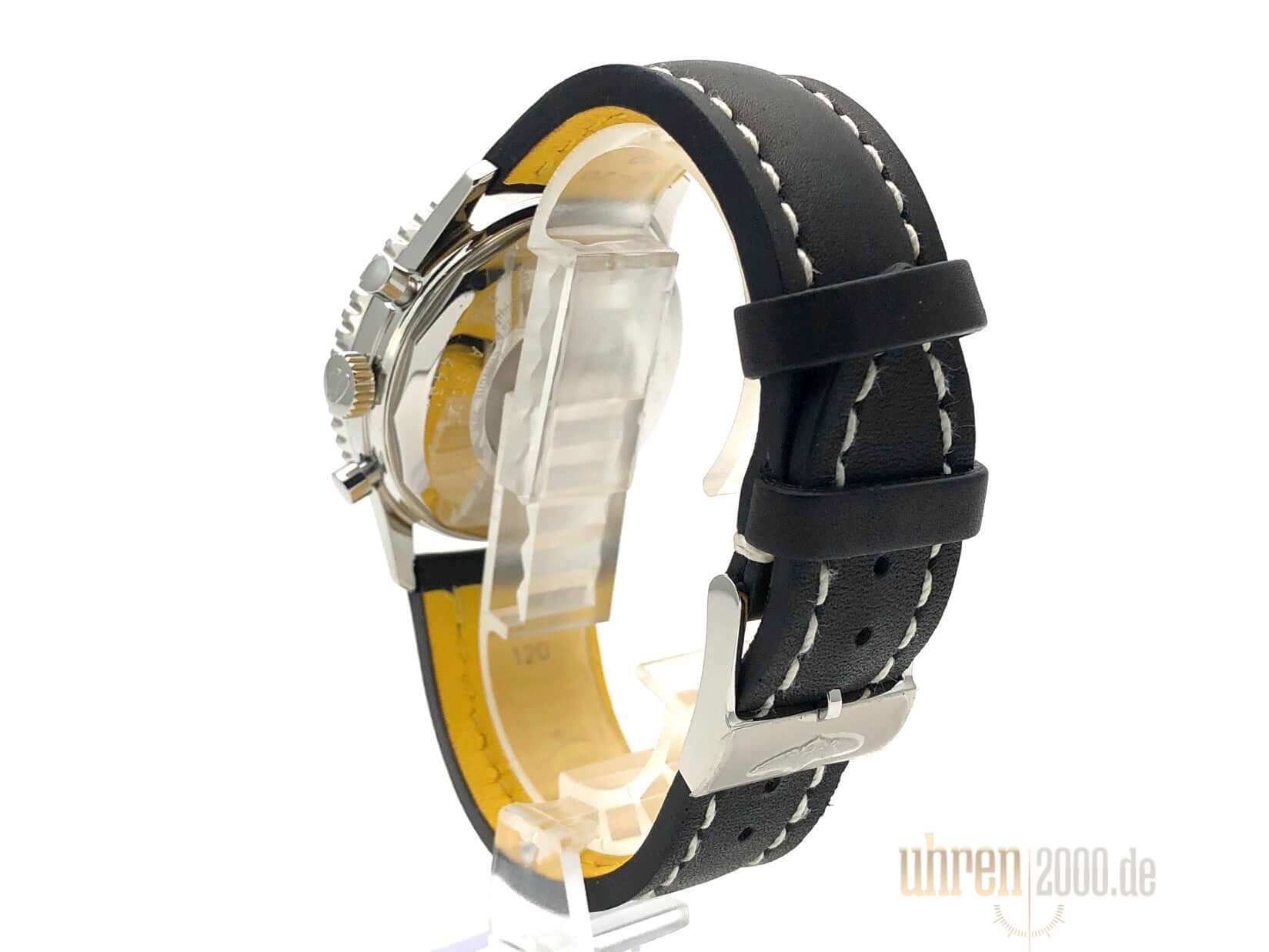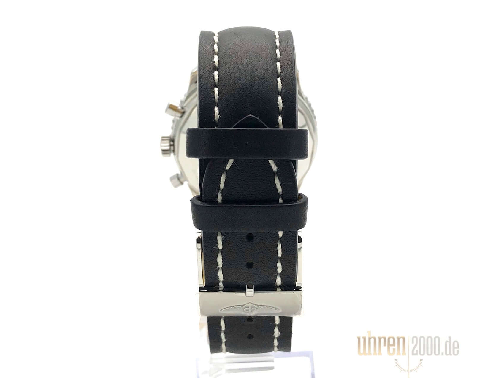 Case made of polished and satin-finished stainless steel, case diameter 41.5 mm, case height 14.2 mm, stainless steel bezel with slide rule and rotatable, black leather strap with pin buckle, black dial with applied Arabic numerals, luminous hands, automatic movement, Breitling 13, vibration 28,800 A/ h, power reserve for approx. 42 hours, date display, chronometer, cambered sapphire crystal with anti-reflective coating on both sides, screwed and engraved stainless steel back, water resistant up to 3 bar.