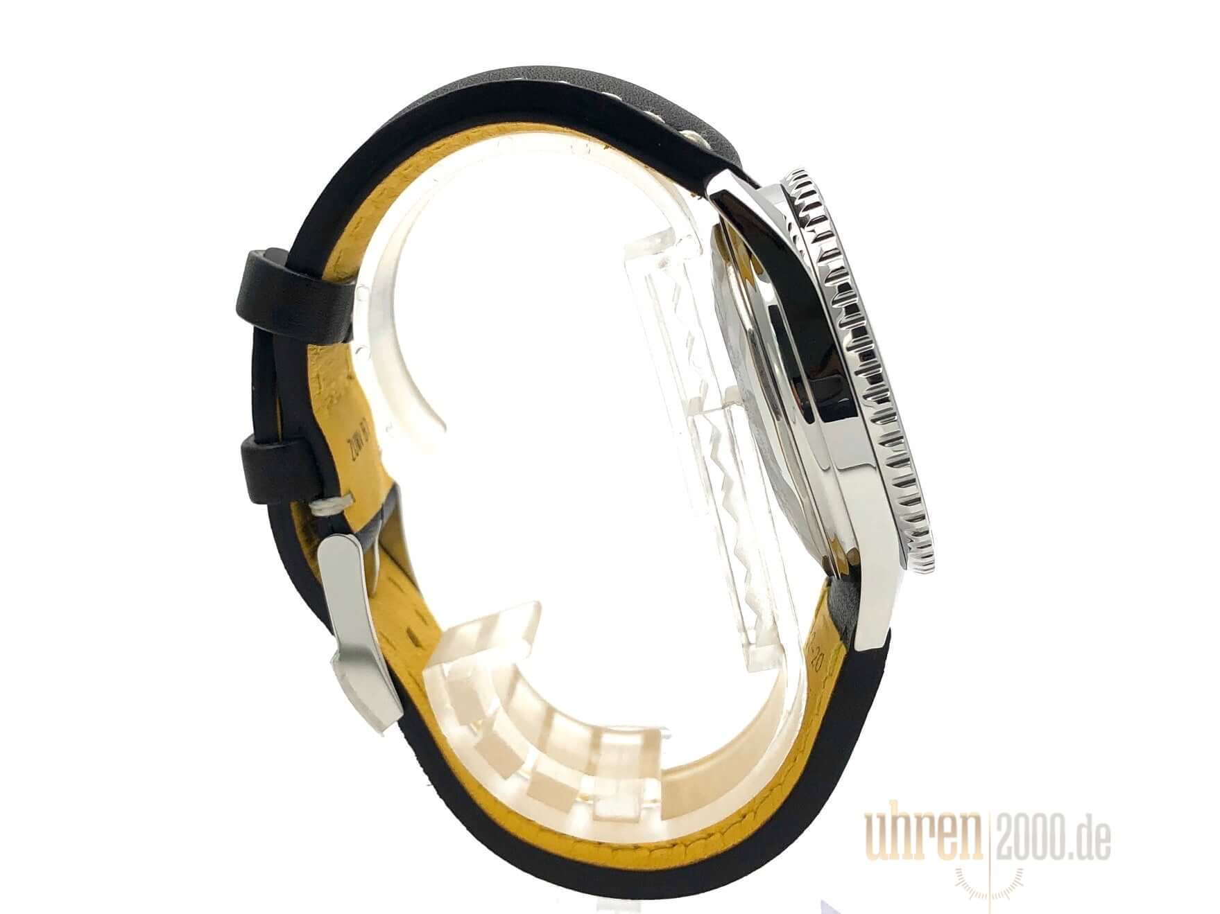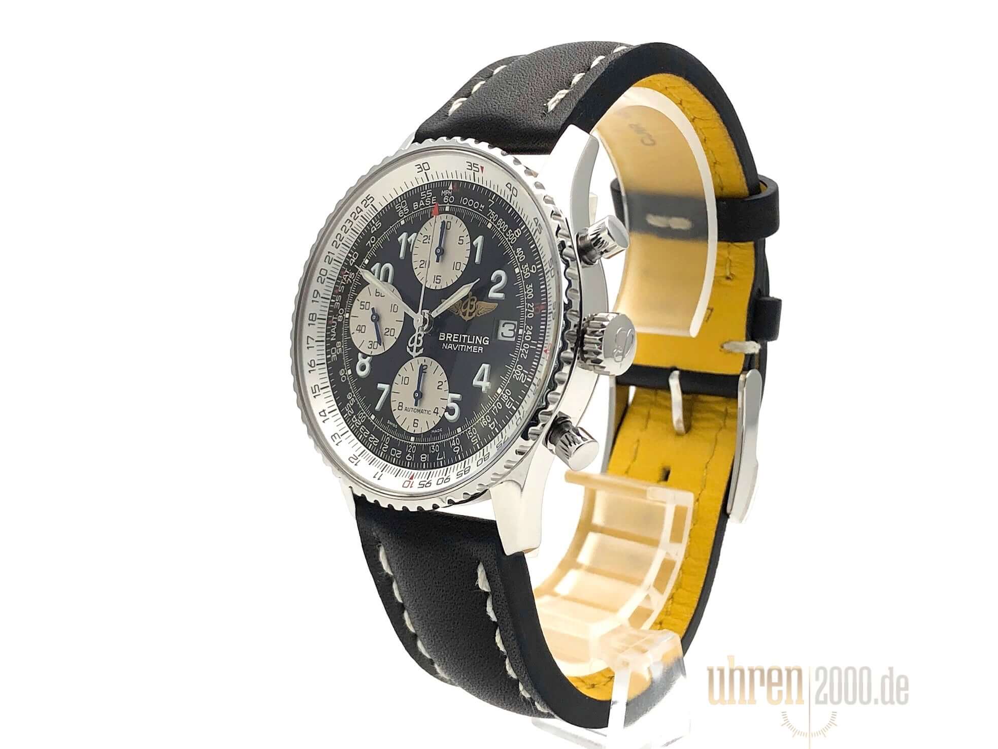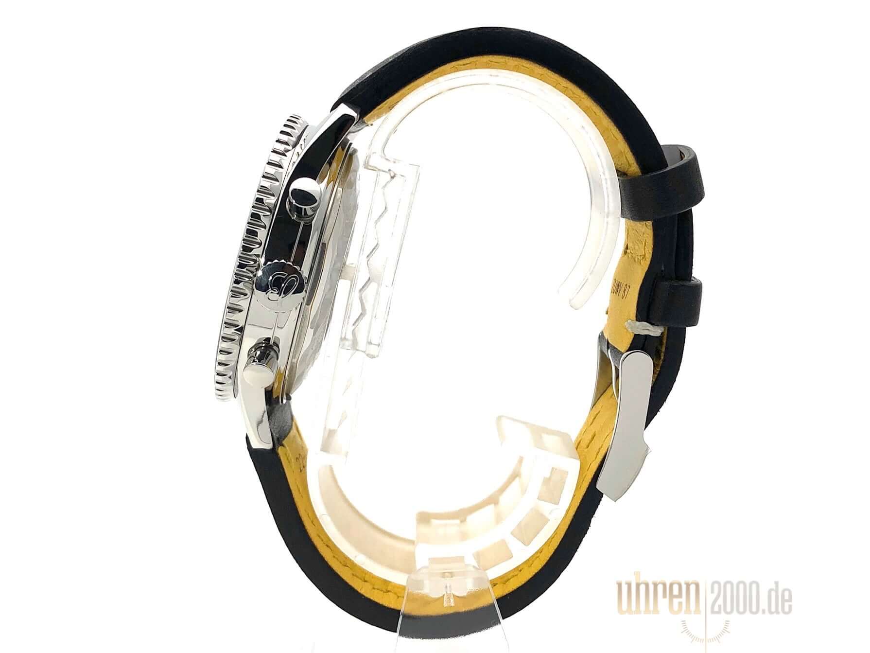 Case made of polished and satin-finished stainless steel, case diameter 41.5 mm, case height 14.2 mm, stainless steel bezel with slide rule and rotatable, black leather strap with pin buckle, black dial with applied Arabic numerals, luminous hands, automatic movement, Breitling 13, vibration 28,800 A/ h, power reserve for approx. 42 hours, date display, chronometer, cambered sapphire crystal with anti-reflective coating on both sides, screwed and engraved stainless steel back, water resistant up to 3 bar.