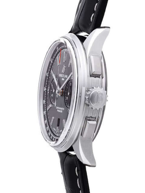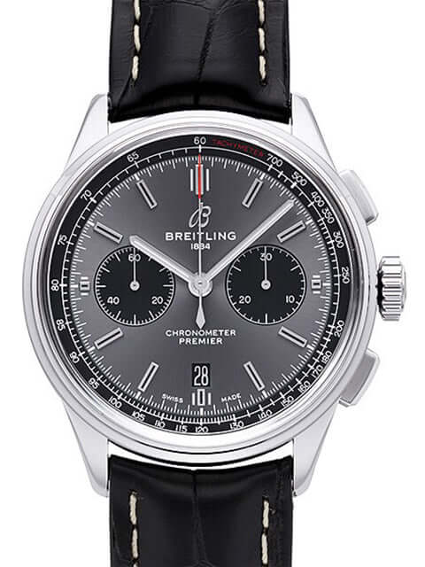 Case made of polished and satin-finished stainless steel, case diameter 42 mm, case height 13.65 mm, polished stainless steel bezel, anthracite-colored dial with applied luminous indices, luminous hands, black totalizers, black crocodile leather with folding clasp, automatic movement, manufacture caliber Breitling 01 with 47 jewels, 28,800 A/h , power reserve approx. 70 hours, date display, chronograph, chronometer, cambered sapphire crystal with anti-reflective coating on both sides, screwed stainless steel base, engraved with viewing window, water resistant up to 10 bar.