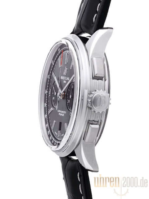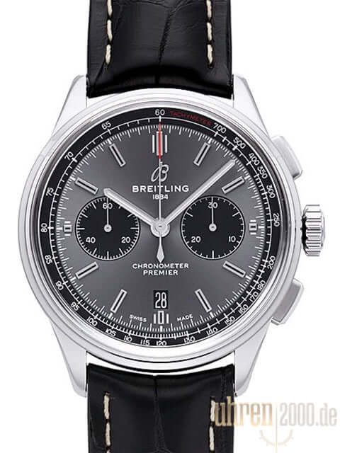 Case made of polished and satin-finished stainless steel, case diameter 42 mm, case height 13.65 mm, polished stainless steel bezel, black crocodile leather with pin buckle, anthracite-colored dial with applied luminous indices, luminous hands, black totalizers, automatic movement, manufacture caliber Breitling 01 with 47 jewels, 28,800 A/h , power reserve approx. 70 hours, date display, chronograph, chronometer, cambered sapphire crystal with anti-reflective coating on both sides, screwed stainless steel base, engraved with viewing window, water resistant up to 10 bar.