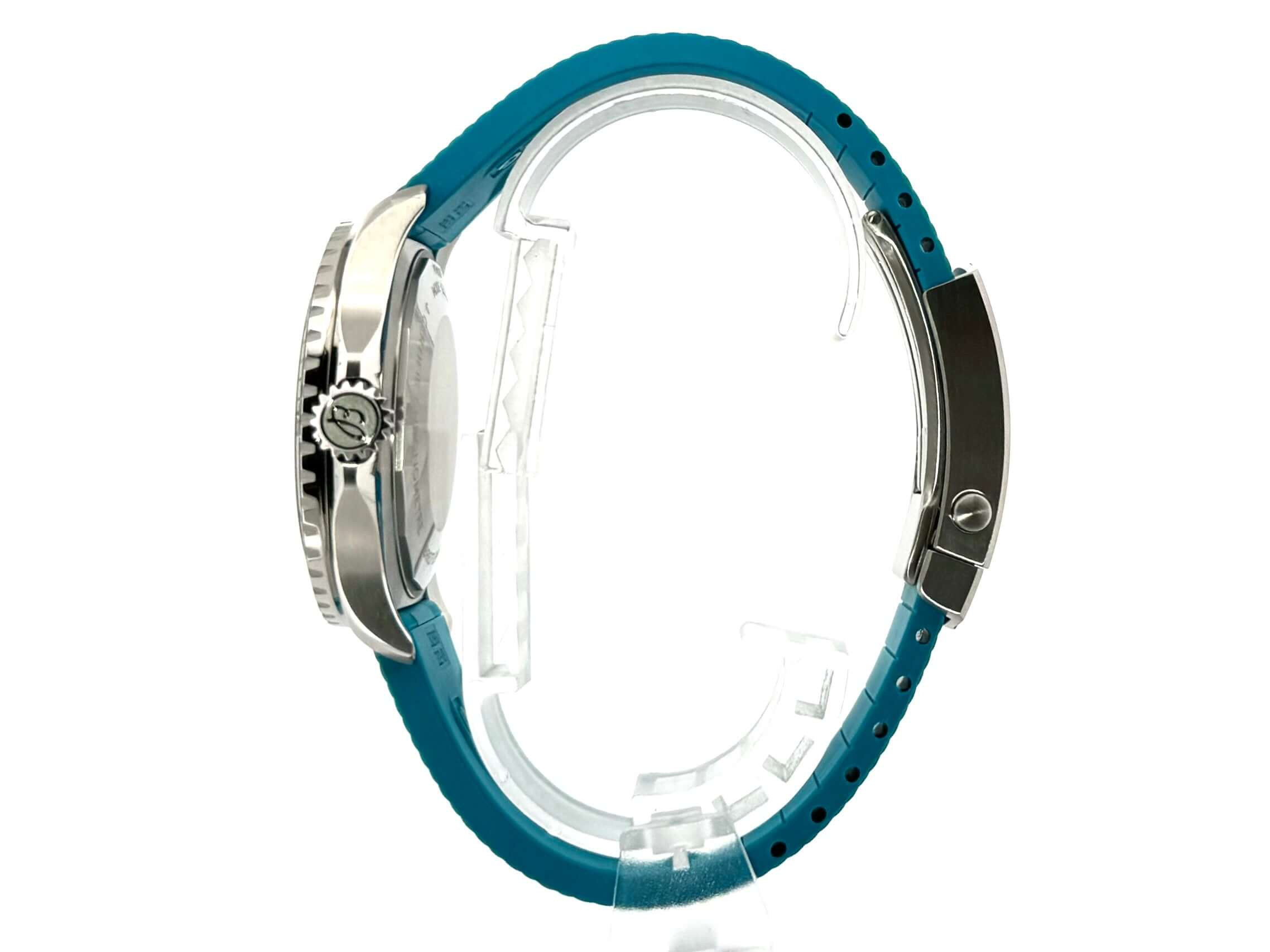 Case made of polished and satin-finished stainless steel, case diameter 42 mm, case height 12.5 mm, stainless steel bezel with black ceramic inlay, unidirectional rotating with lock, turquoise rubber strap with folding clasp, black dial with applied luminous indices, luminous hands, automatic, Breitling caliber 17, 25 jewels , 28,800 A/h, power reserve approx. 38 hours, chronometer, stop-seconds for setting the time to the second, sapphire crystal with double-sided anti-reflective coating and cambered, screw-down crown with side protection, screw-down stainless steel base, water-resistant up to 30 bar.