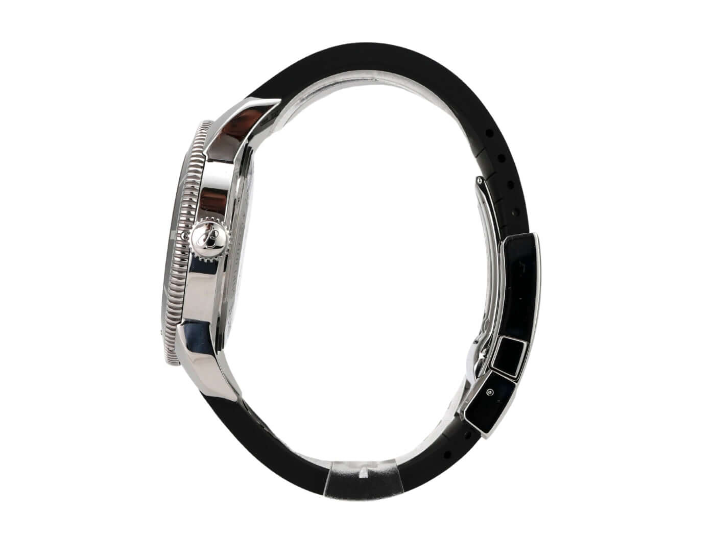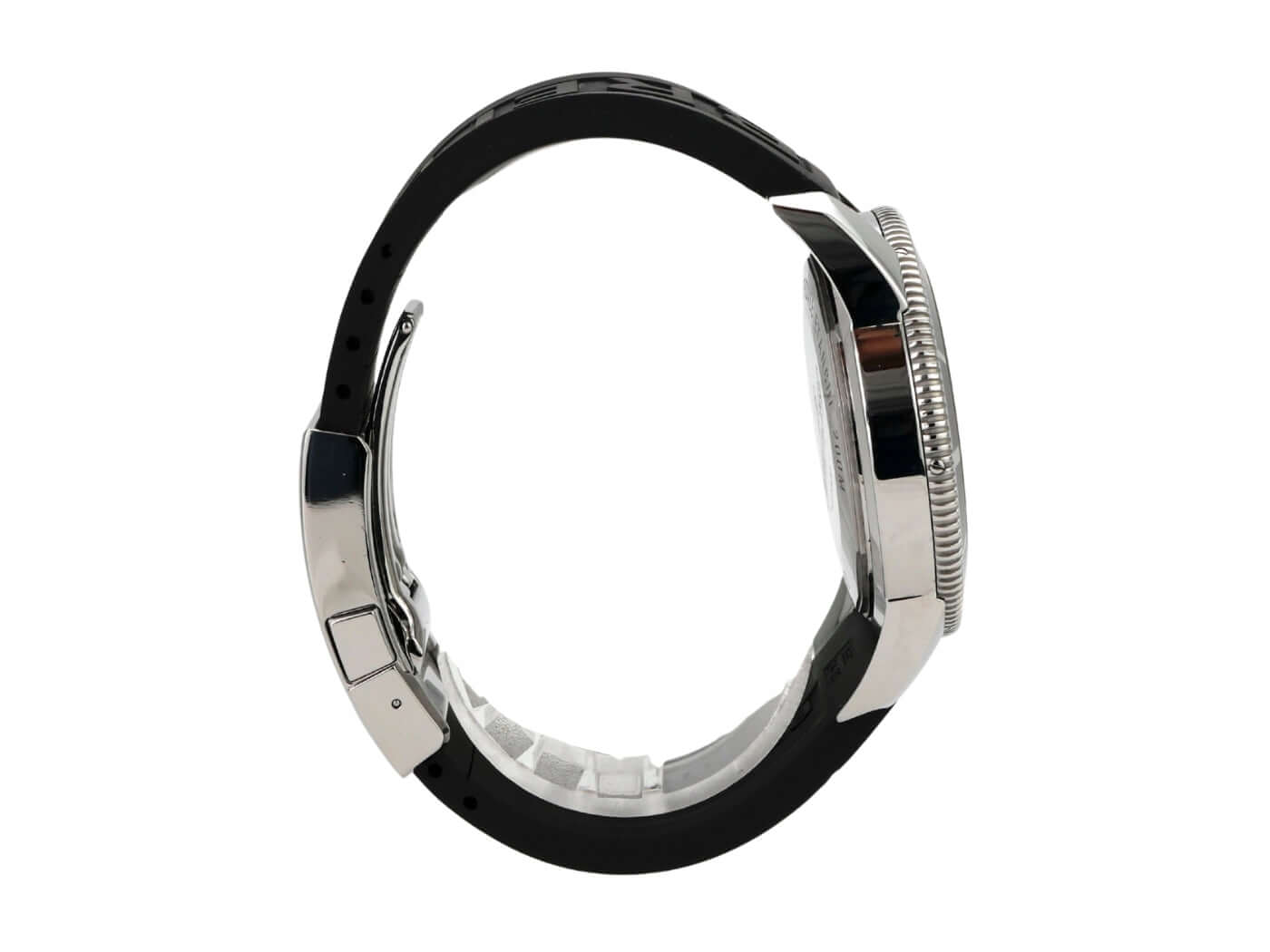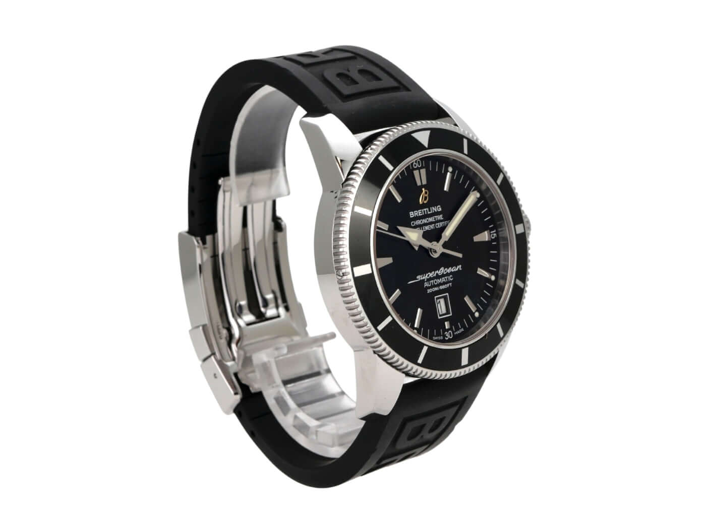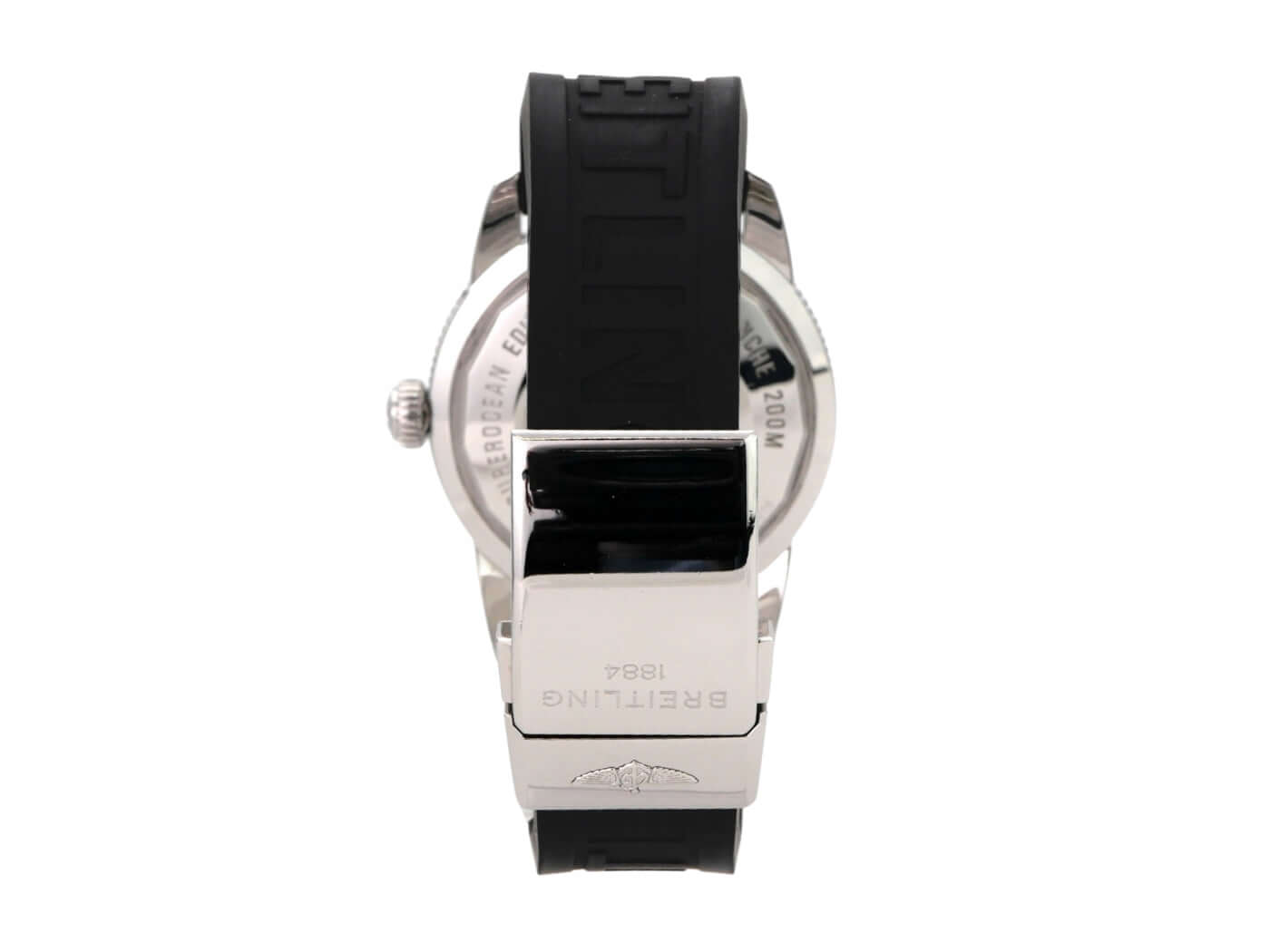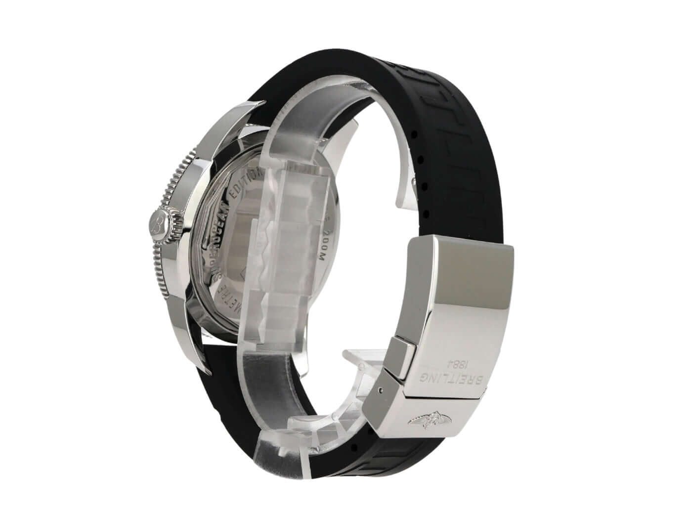 Case made of polished and satin-finished stainless steel, case diameter 46 mm, case height 13.6 mm, stainless steel bezel with black insert and 60-minute scale, unidirectional rotating with lock, black rubber strap with folding clasp, black dial with applied luminous indices, luminous hands, automatic, Breitling caliber 17 with 25 jewels, frequency 28,800 A/h, power reserve of approx. 40 hours, date display, chronometer with certificate, sapphire crystal, double-sided anti-reflective and domed, screw-down crown, screw-down stainless steel case back, water-resistant up to 20 bar.
