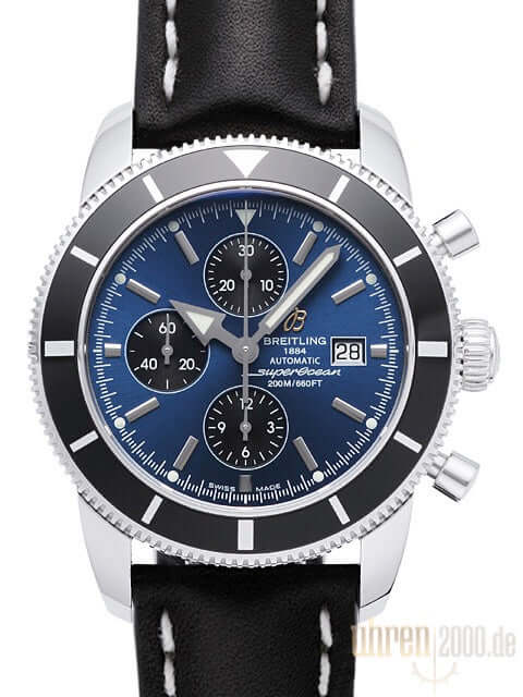 Case made of polished and satin-finished stainless steel, case diameter 46 mm, case height 16.4 mm, stainless steel bezel with black inlay, rotatable in one direction with lock, blue dial with applied luminous indexes, luminous hands, black leather strap with folding clasp, automatic movement, Breitling caliber 13 with 25 jewels, oscillation 28,800 A/h, power reserve for approx. 42 hours, date display, chronometer with certificate, sapphire crystal, double-sided anti-reflective coating and cambered, screwed crown with 2 seals, screwed stainless steel back, water resistant up to 20 bar.