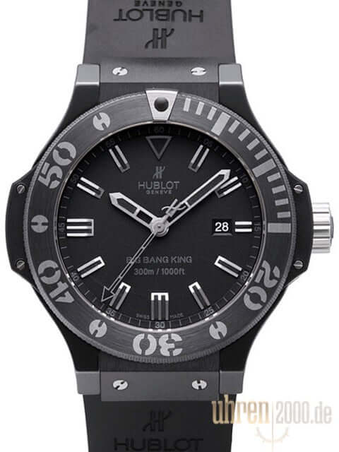 Ceramic case, case diameter 48 mm, case height 16 mm, rotating ceramic bezel, black dial with applied luminous indices and luminous markings, black rubber strap with folding clasp, automatic movement, caliber HUB1400 with 42 jewels, vibration 28,800 A/h, power reserve for approx. 42 hours. Date display, anti-reflective sapphire crystal, screwed and engraved back, water resistant up to 30 bar.
