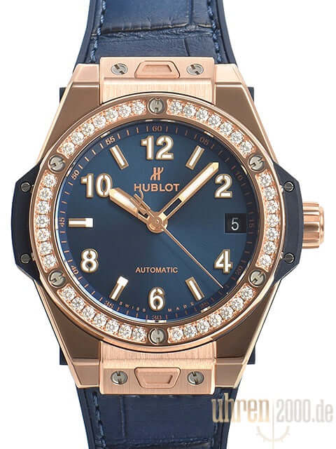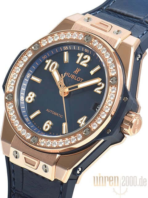 Case made of King Gold polished and satined, case diameter 39 mm, King Gold bezel with diamonds, blue dial, blue rubber strap with alligator leather inlay and folding clasp, automatic movement, caliber HUB1710, power reserve for approx. 50 hours, sapphire crystal anti-reflective coating, sapphire crystal back screwed and engraved, waterproof up to 10 bar.