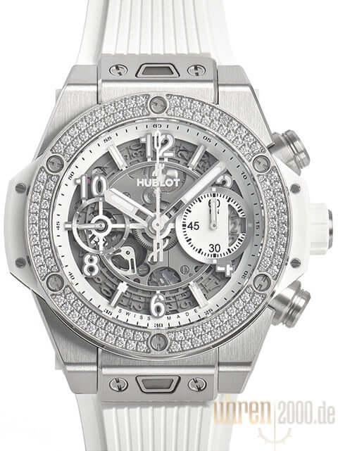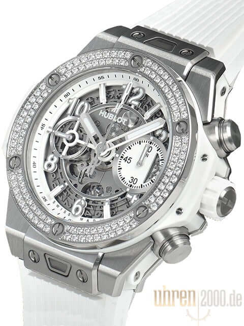 Case made of satin-finished titanium, case diameter 42 mm, titanium bezel set with 126 diamonds, transparent dial with luminous indices and luminous numbers, white rubber strap with titanium folding clasp, automatic movement, chronograph, manufacture caliber UNICO HUB1280, oscillation 28,800 A/h, power reserve for approx. 72 Hours, date display, anti-reflective sapphire crystal, screwed sapphire crystal back, water resistant up to 10 bar.