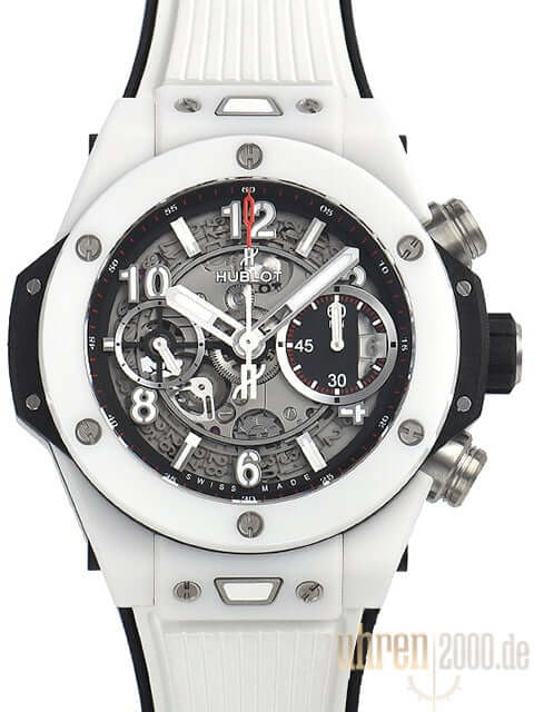 Case made of white ceramic, case diameter 42 mm, white ceramic bezel, transparent dial with luminous indices and luminous numbers, white rubber strap with titanium folding clasp, automatic movement, chronograph, manufacture caliber UNICO HUB1280, vibration 28,800 A/h, power reserve for approx. 72 hours, date display, Anti-reflective sapphire crystal, screwed sapphire crystal back, water resistant up to 10 bar.