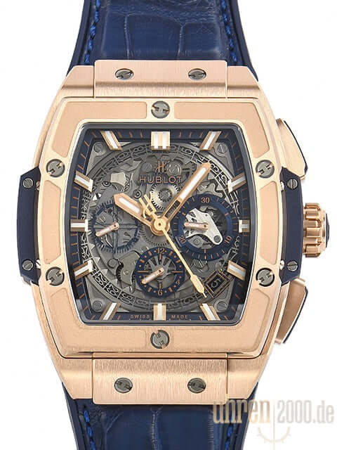 Case made of 18 kt red gold polished and satined, case diameter 42 mm, red gold bezel satined, transparent dial, blue rubber / leather strap with folding clasp, automatic movement, chronograph, manufacture caliber HUB4700, power reserve for approx. 50 hours, date display, sapphire crystal anti-reflective coating, sapphire crystal back screwed and engraved , Waterproof up to 10 bar.