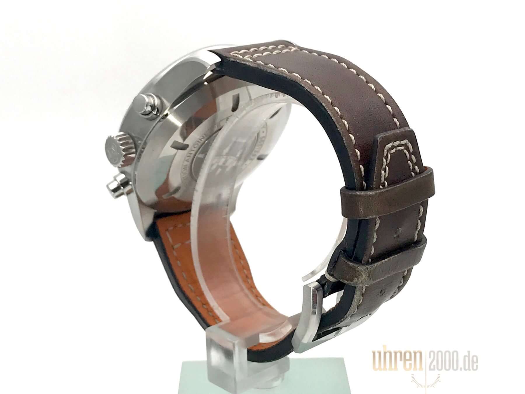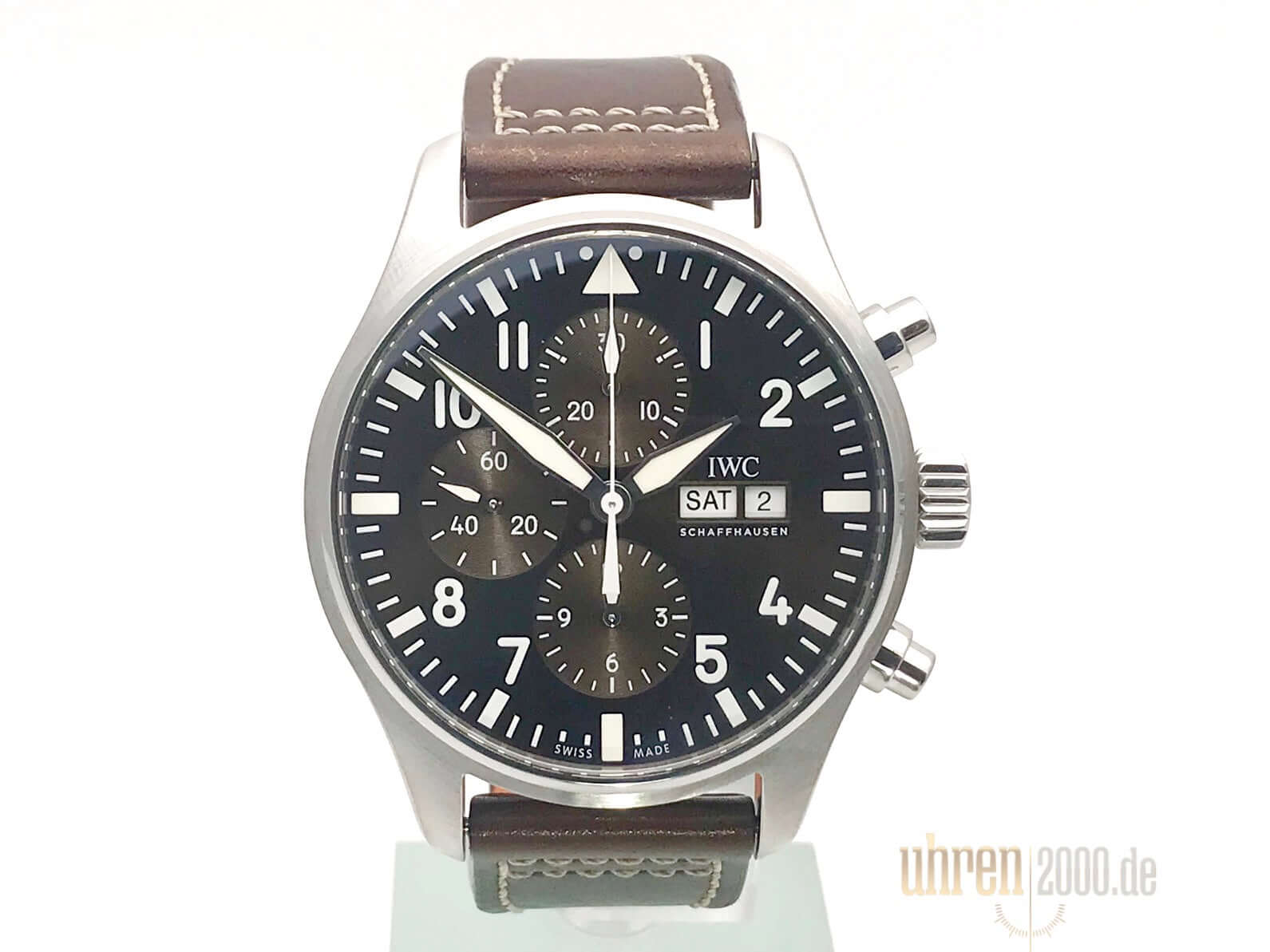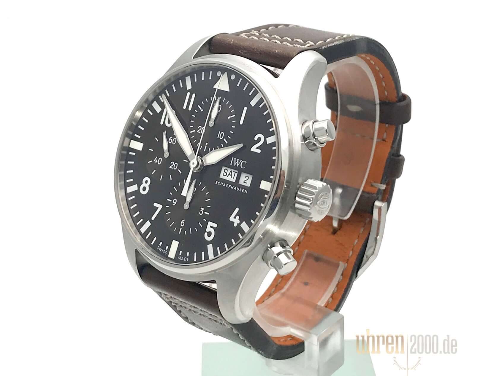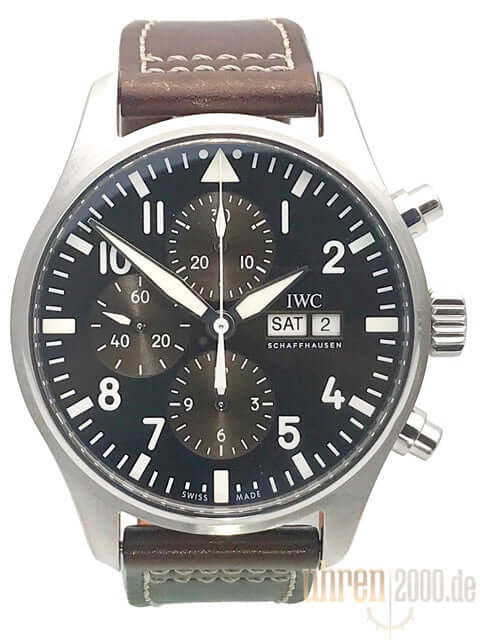 Case made of polished and satin-finished stainless steel, case diameter 43 mm, case height 15 mm, brown leather strap with pin buckle, brown dial, automatic movement, chronograph, IWC caliber 79320, date display, weekday display, power reserve 44 hours, sapphire crystal, water resistant up to 6 bar.
