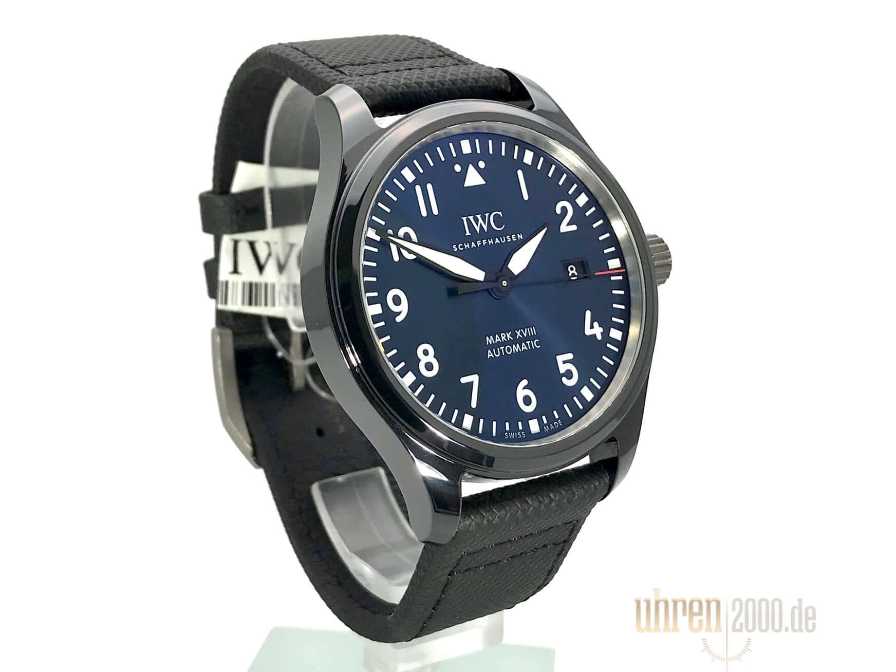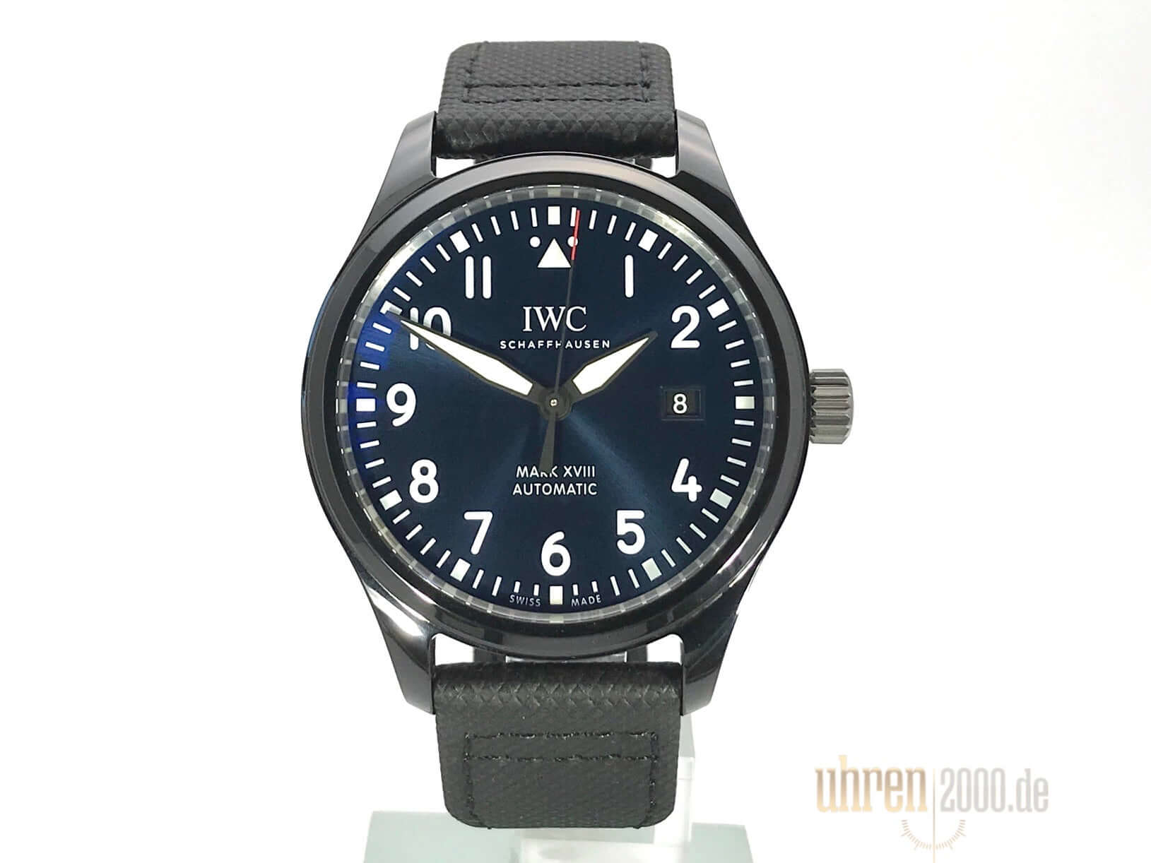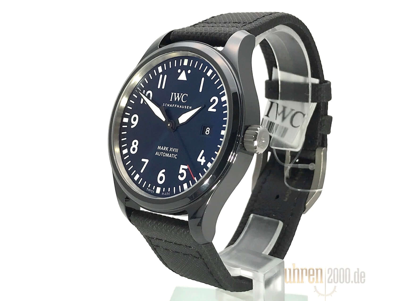 Ceramic case, case diameter 40 mm, case height 11 mm, black textile strap with pin buckle, blue dial, automatic movement, caliber IWC 35111 with 25 jewels, vibration 28,800 A/h, power reserve for approx. 42 hours, date, central seconds with stop device, scratch-resistant sapphire crystal, screwed crown made of titanium, screwed back made of titanium, water resistant up to 6 bar, limited to 1500 pieces.