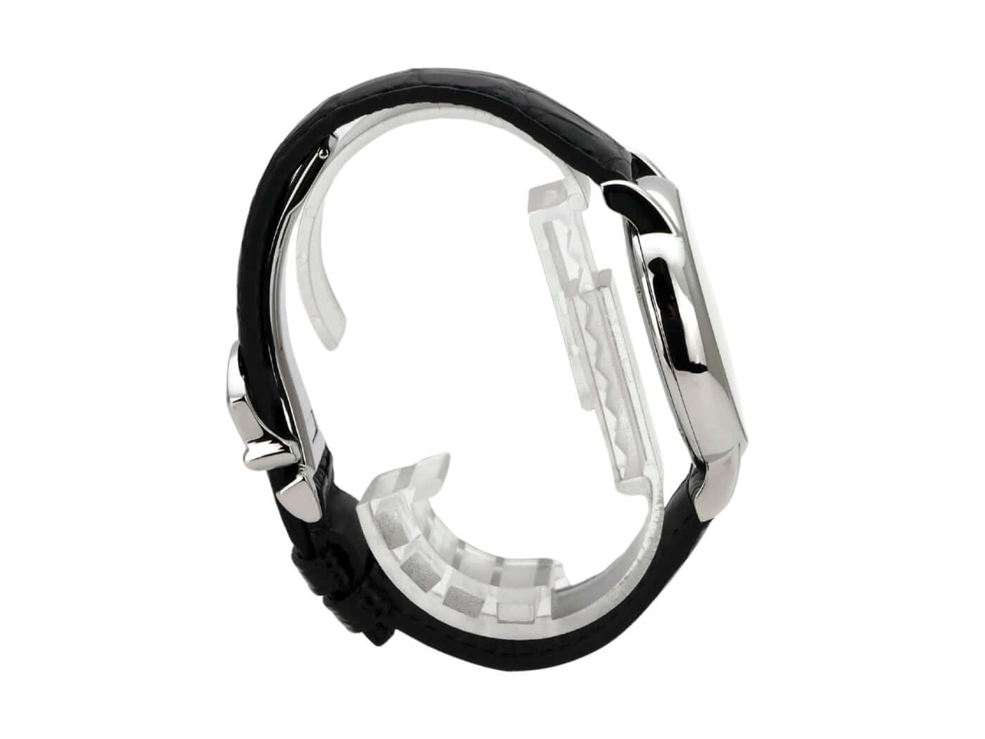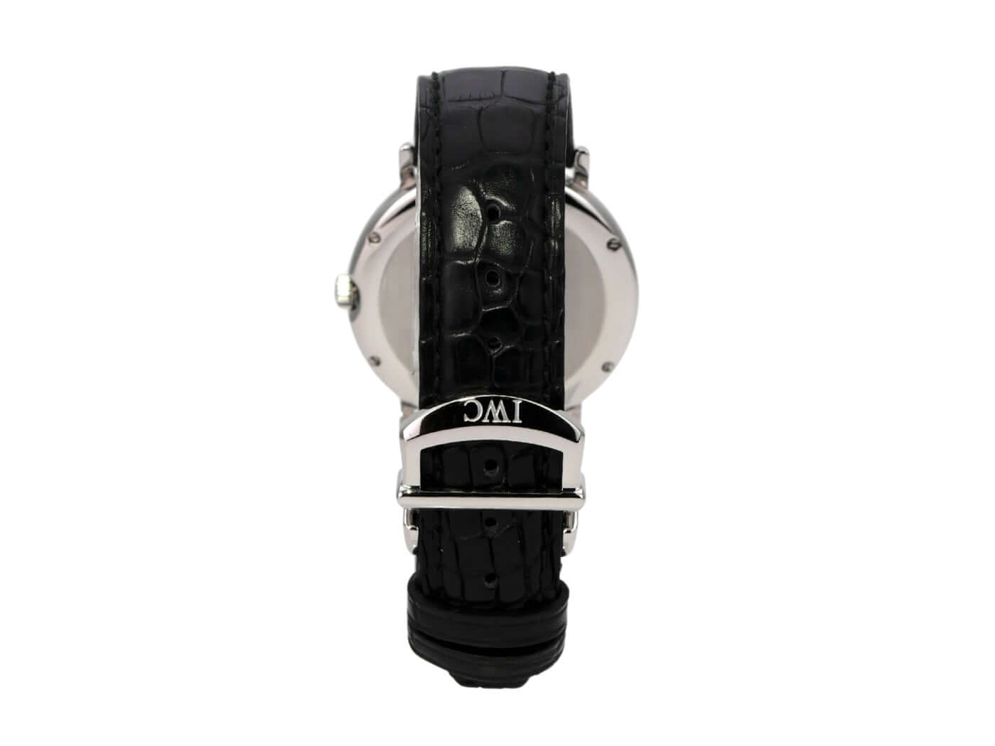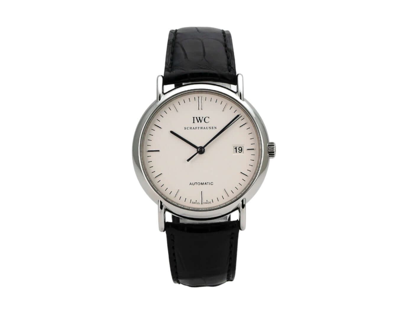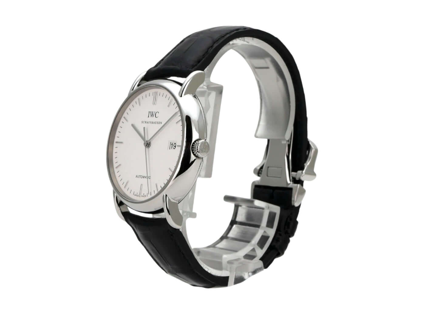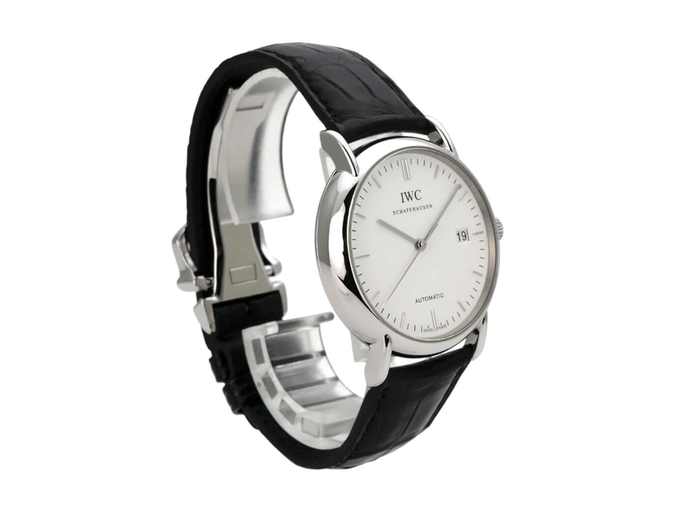 Polished stainless steel case, case diameter 38 mm, case height 8.6 mm, black leather strap with pin buckle, silver dial with applied indices, automatic movement, caliber IWC 30110, frequency 28,800 A/h, power reserve of 42 hours, date, scratch-resistant sapphire crystal, screwed stainless steel case back, water-resistant up to 3 bar.