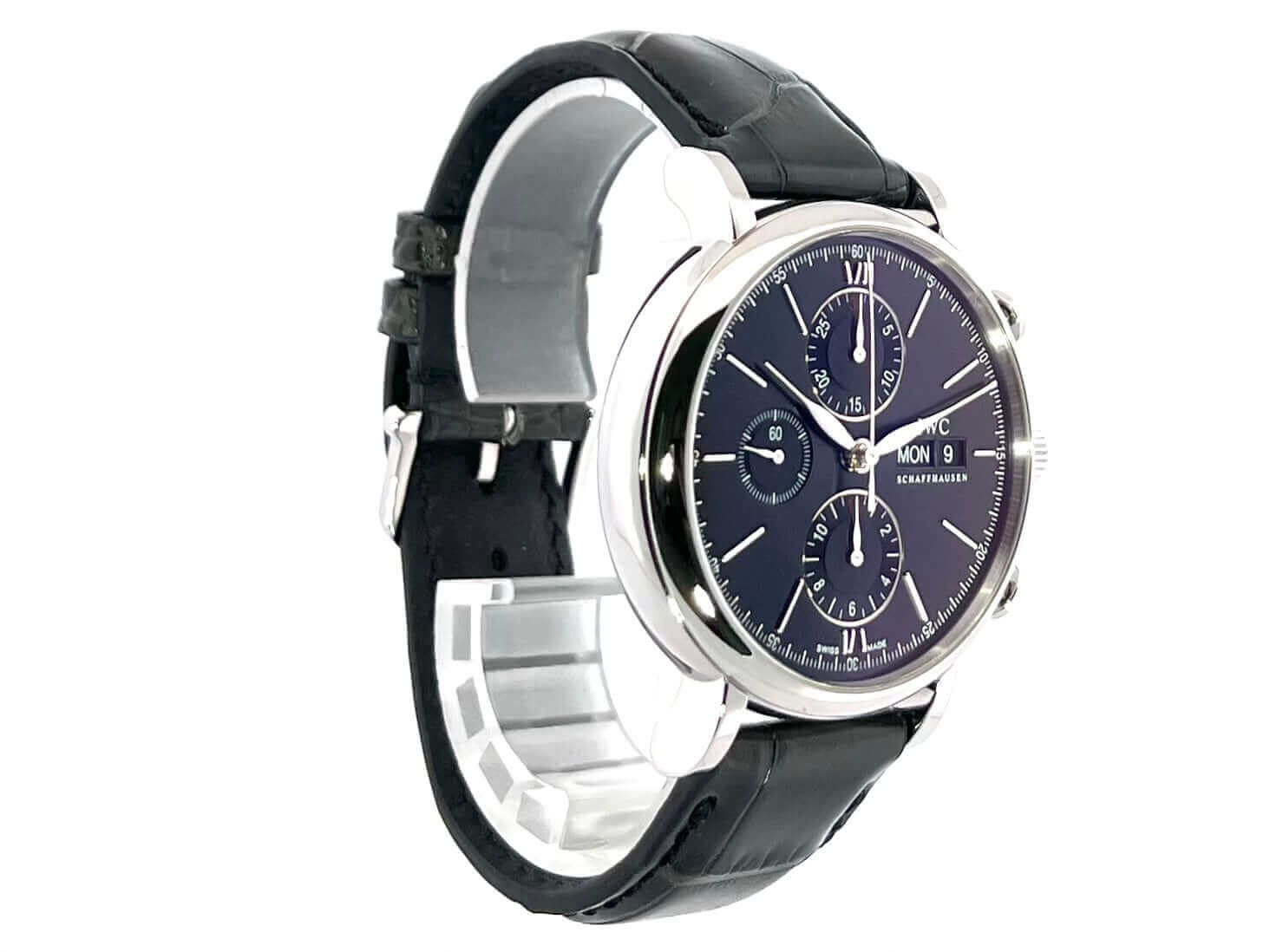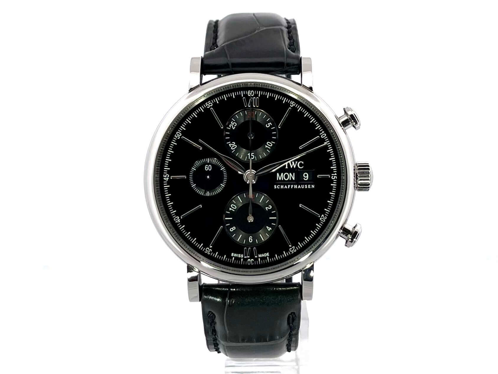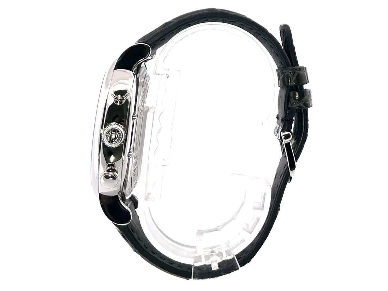 Case polished stainless steel, case diameter 42 mm, case height 13.6 mm, black leather strap with decorative stitching and pin buckle, black dial with applied indices, automatic, caliber 75320 with 25 jewels, date display and weekday display (English), chronograph, sapphire crystal, screwed stainless steel back, Waterproof up to 3 bar.