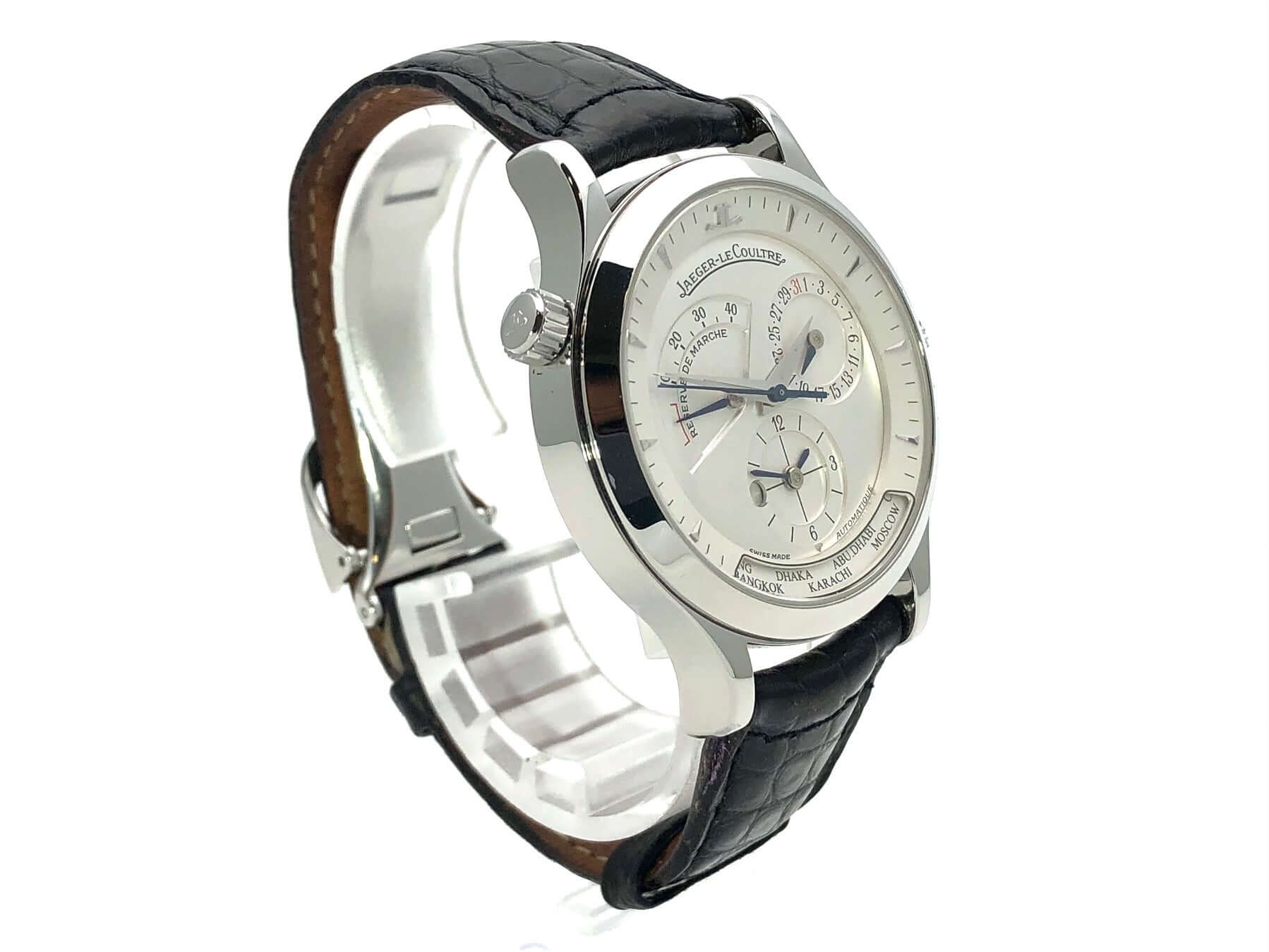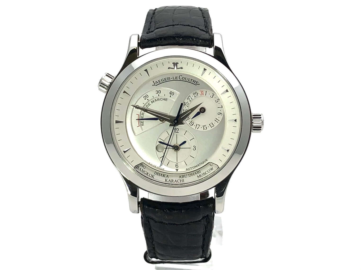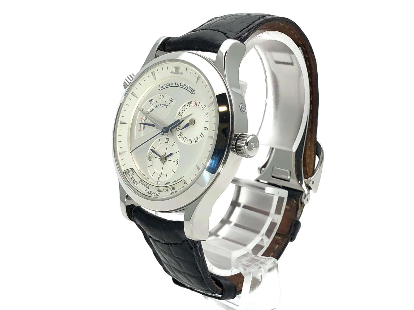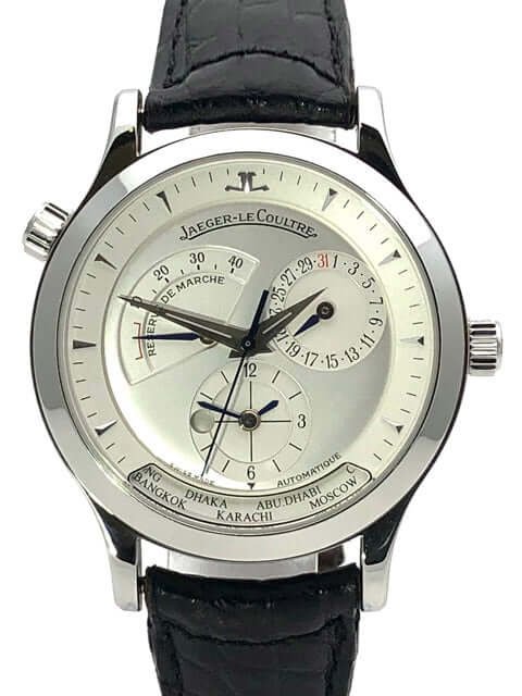 Case made of polished stainless steel, case diameter 38 mm, polished stainless steel bezel, black leather strap with double folding clasp, silver-colored dial, automatic movement, caliber Jaeger-LeCoultre 929/3, 28,800 A/h, power reserve approx. 43 hours, central seconds, date, GMT, sapphire crystal , stainless steel base, waterproof up to 5 bar.