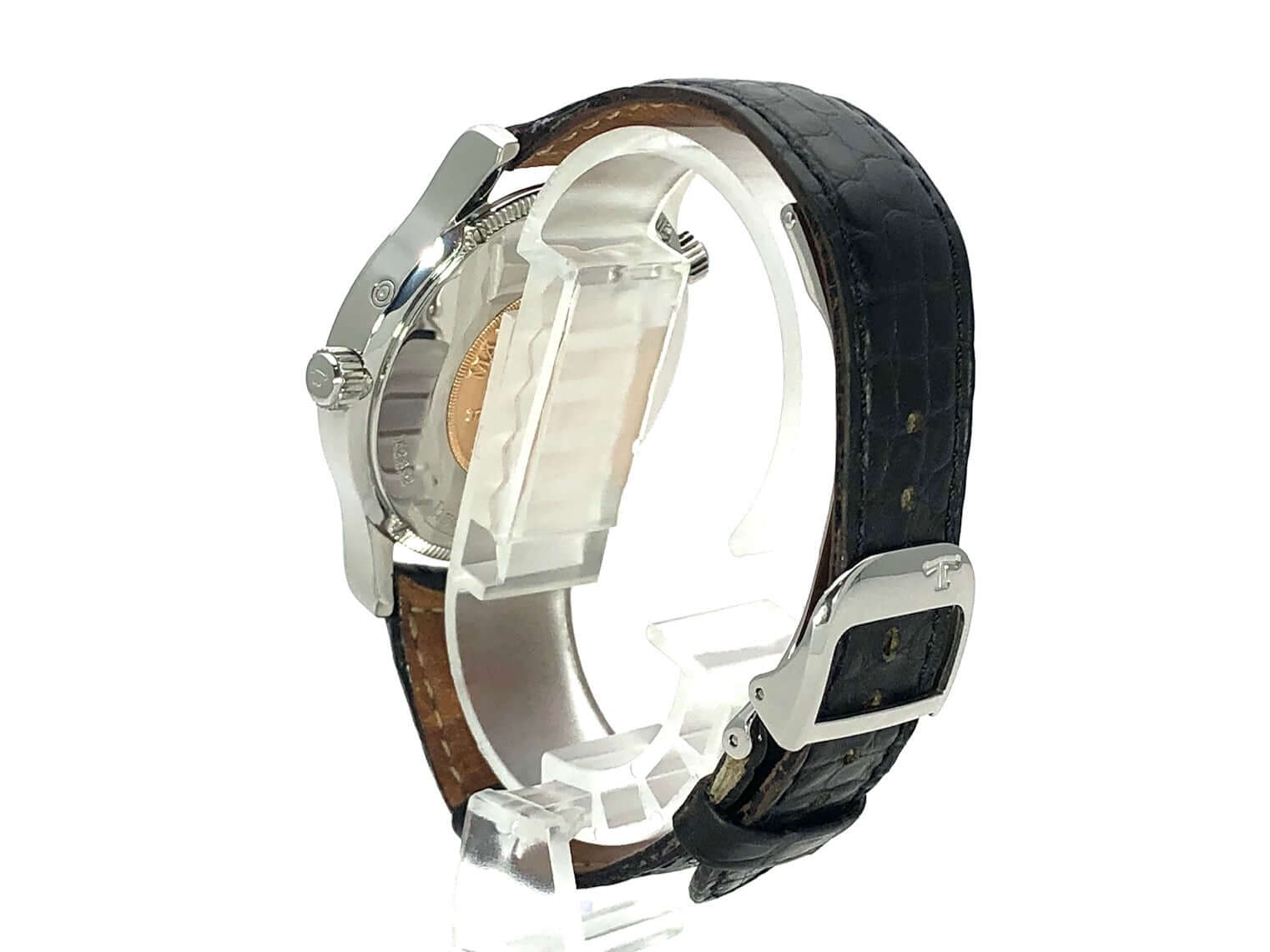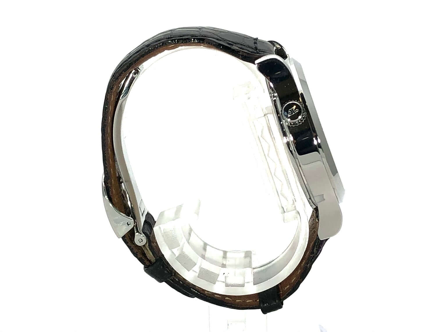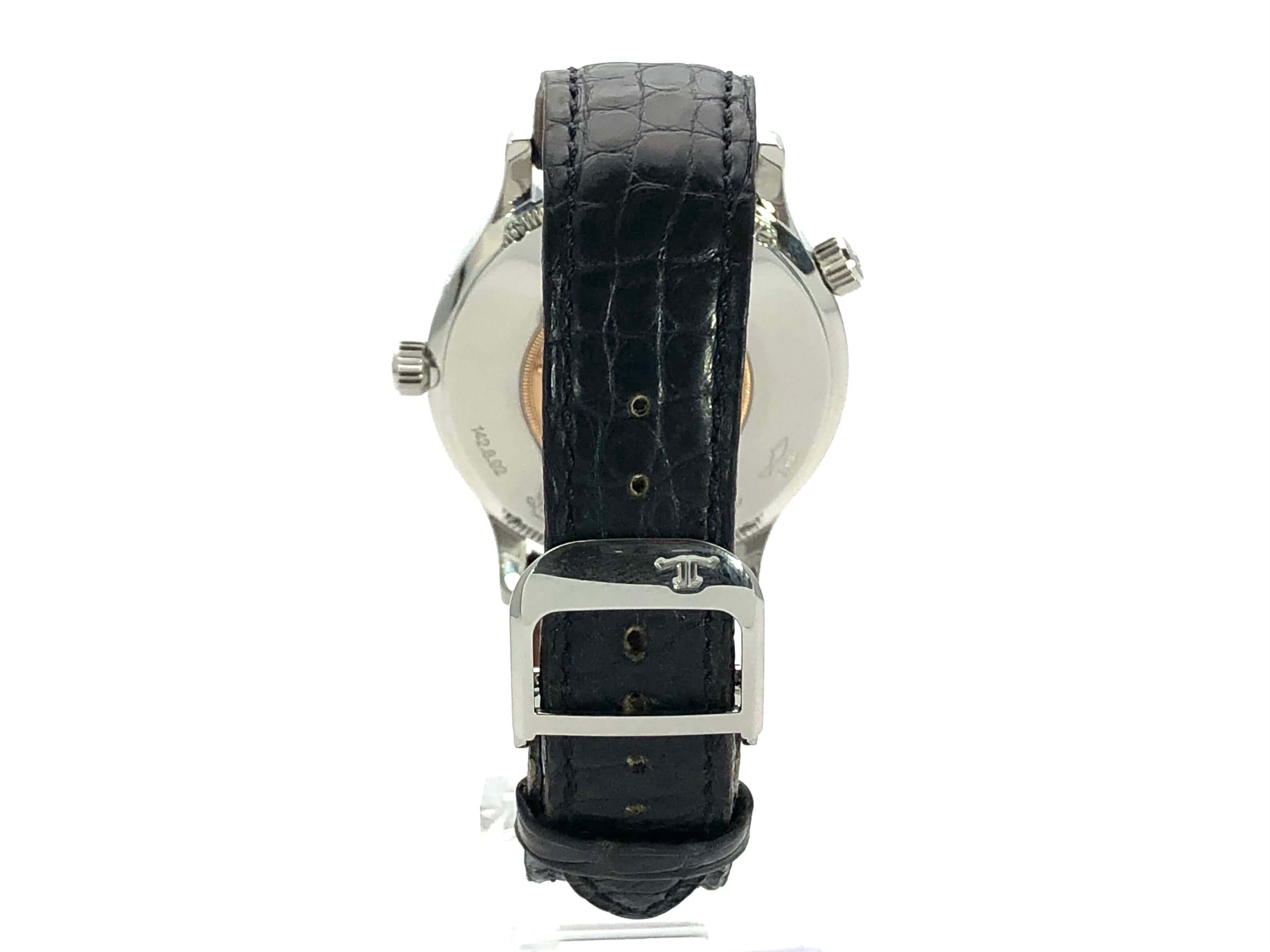 Case made of polished stainless steel, case diameter 38 mm, polished stainless steel bezel, black leather strap with double folding clasp, silver-colored dial, automatic movement, caliber Jaeger-LeCoultre 929/3, 28,800 A/h, power reserve approx. 43 hours, central seconds, date, GMT, sapphire crystal , stainless steel base, waterproof up to 5 bar.