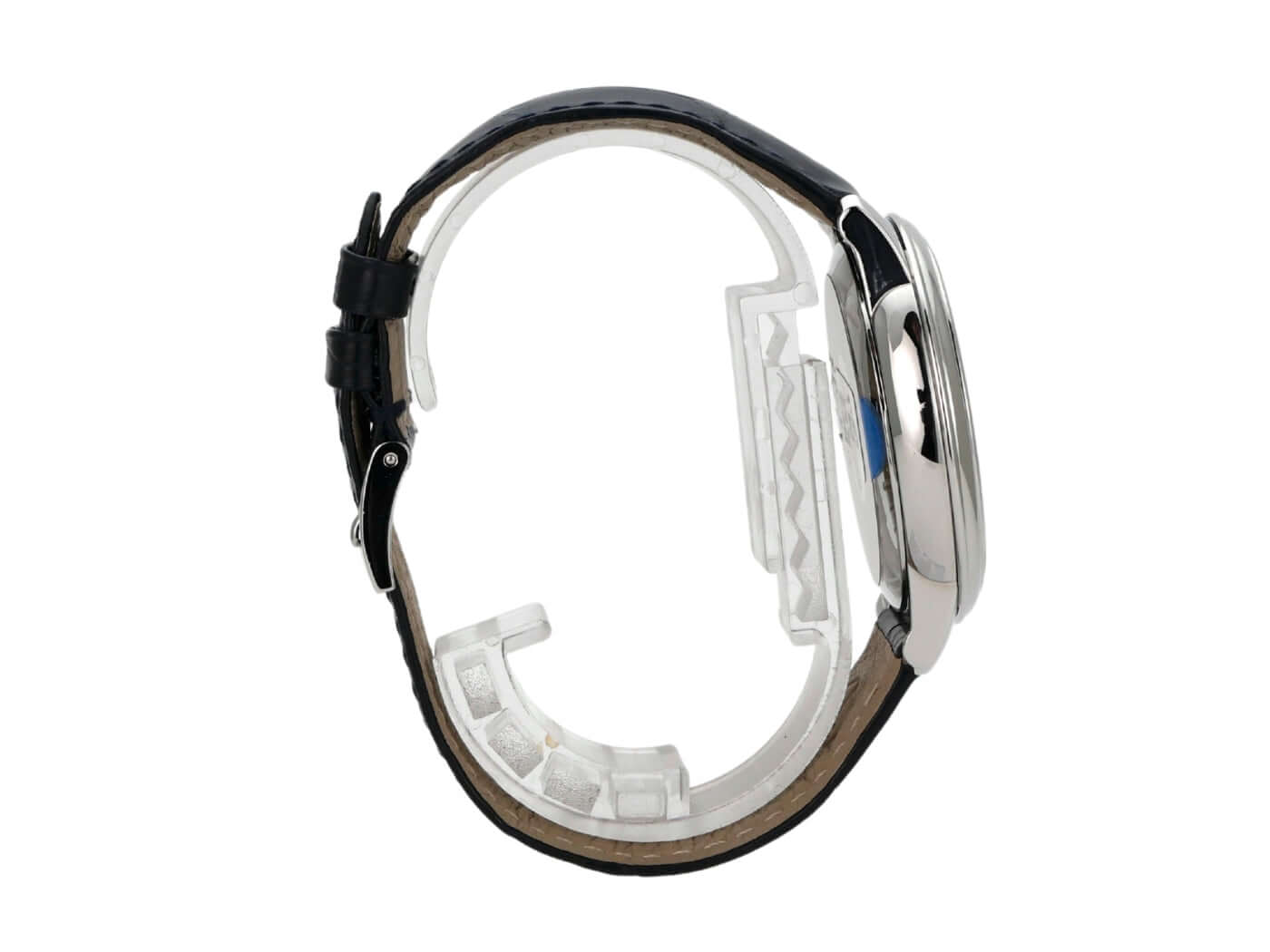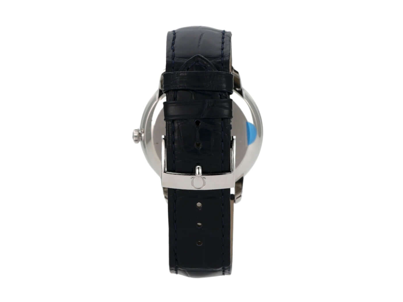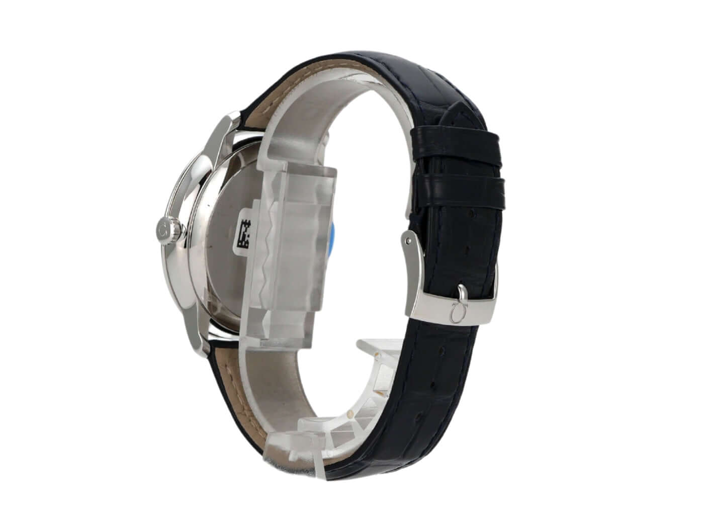 Case made of polished stainless steel, case diameter 39.5 mm, bezel made of polished stainless steel, black leather strap with pin buckle, blue dial with sunburst finish and applied Roman numerals, automatic movement, caliber Omega 2500 with Co-Axial escapement, 27 jewels, 25,200 A/h, power reserve approx. 48 hours, date display, chronometer, sapphire crystal, stainless steel back, water-resistant up to 3 bar.