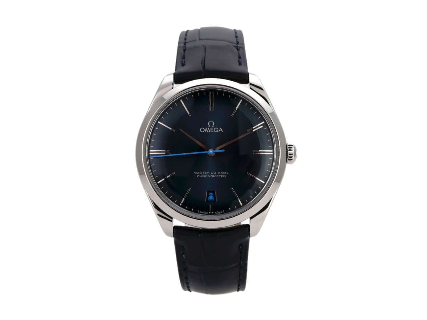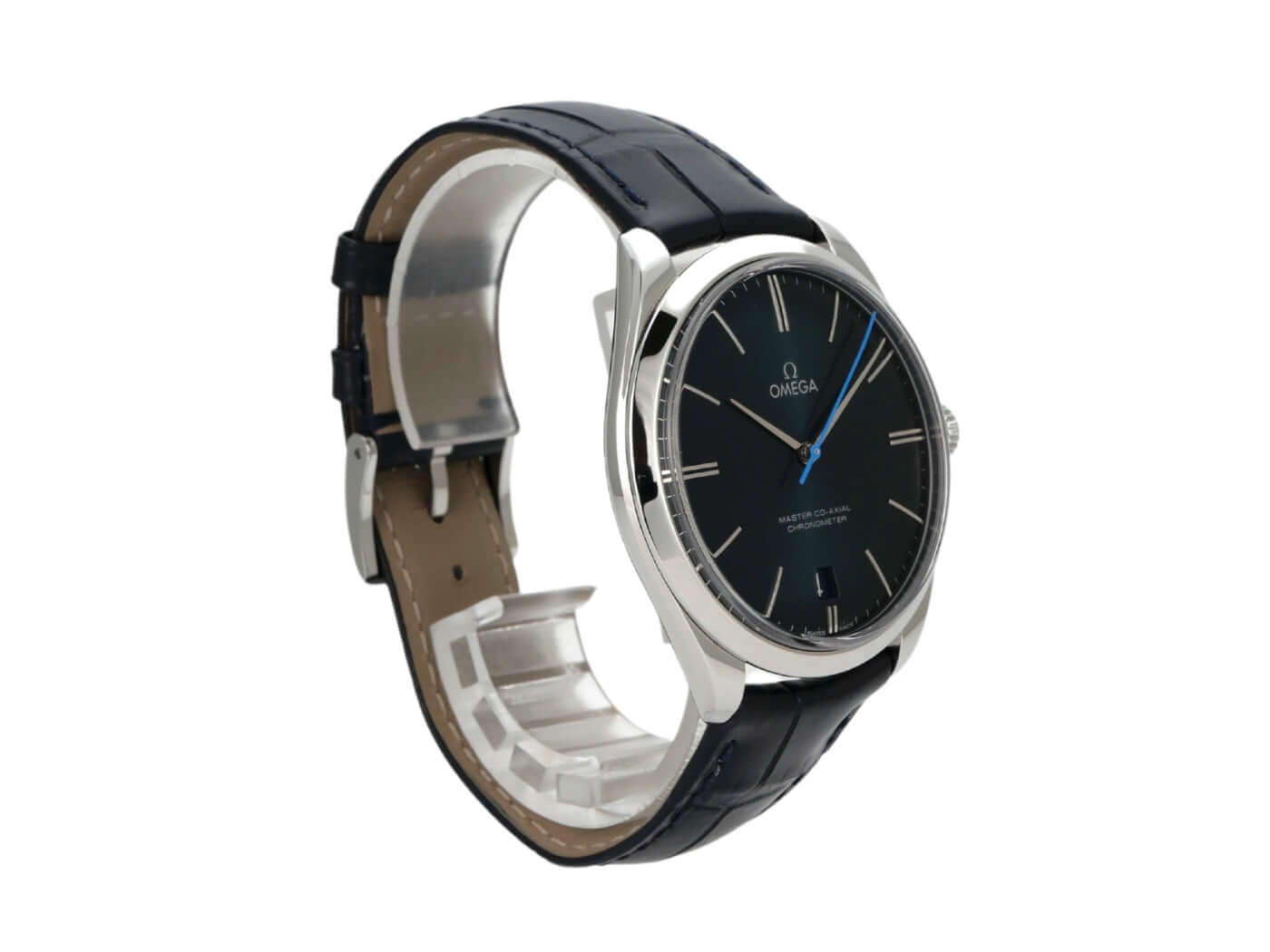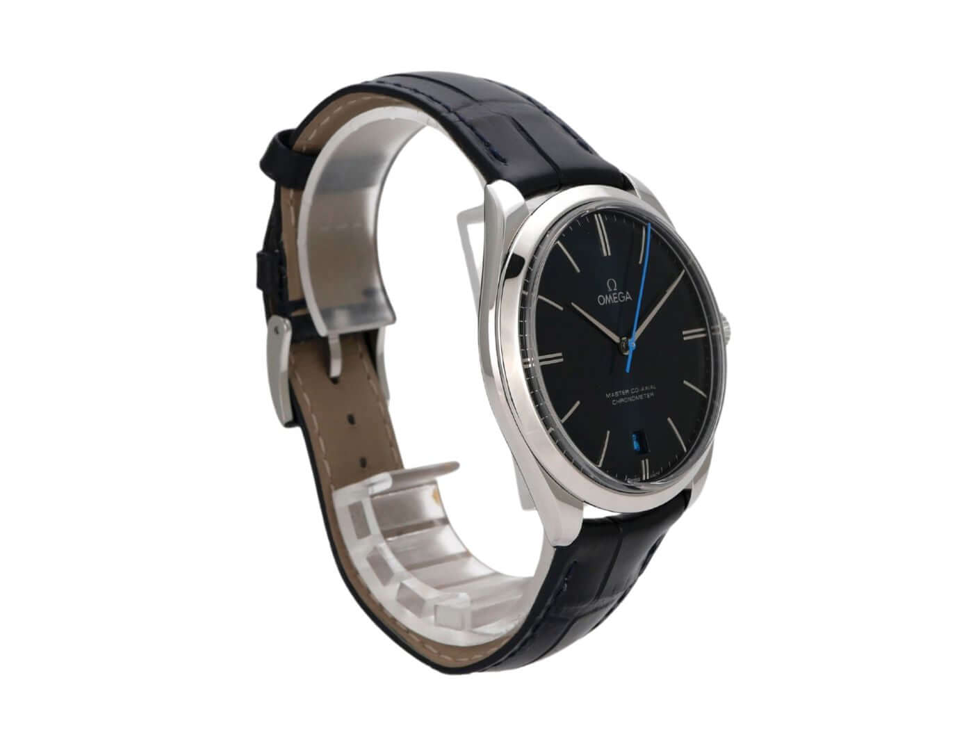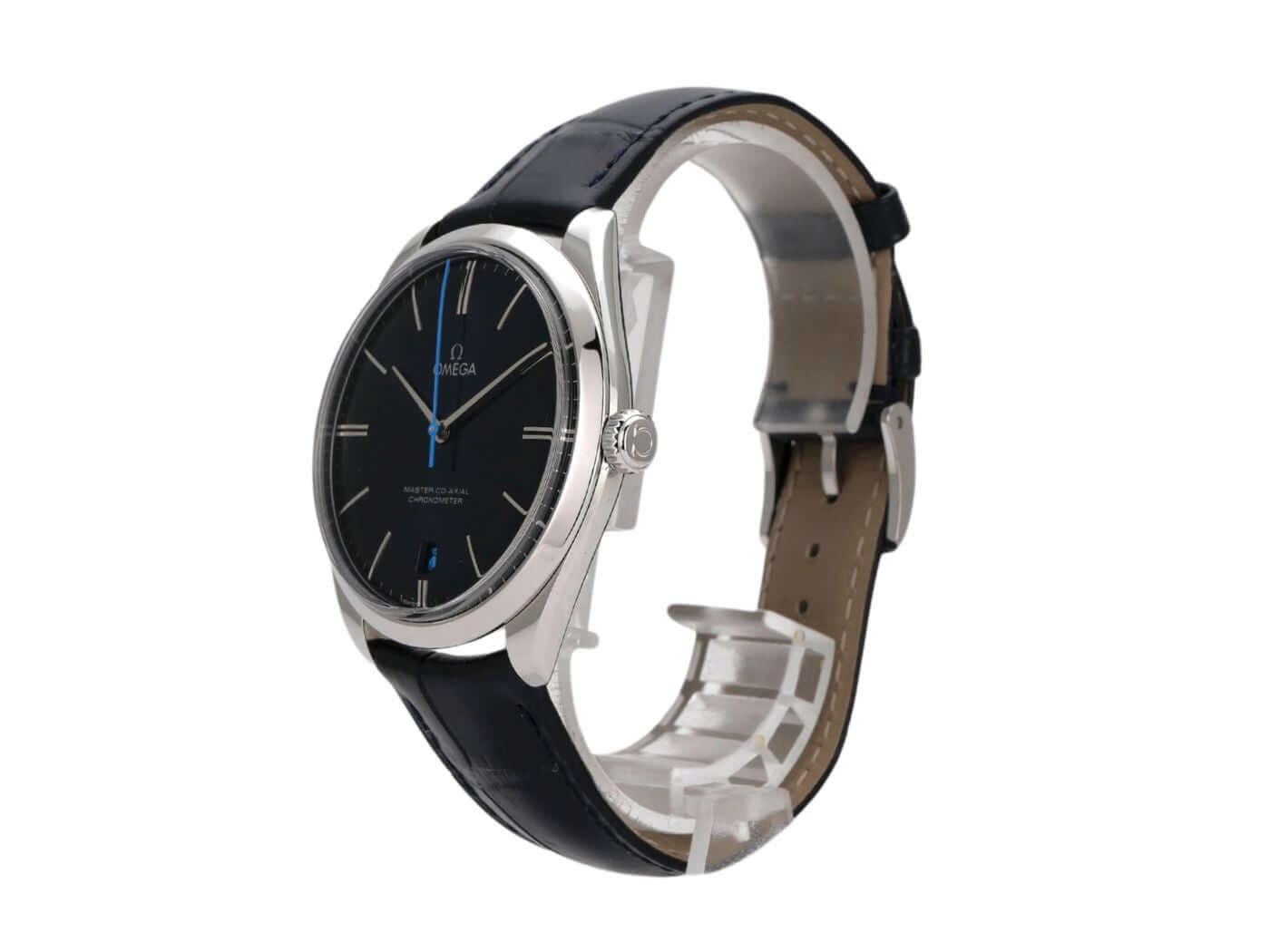 Case made of polished and satin-finished stainless steel, case diameter 40 mm, stainless steel bezel smooth and polished, blue leather strap with pin buckle, blue dial with applied white gold indices, white gold hands, manual winding, anti-magnetic movement that withstands a load of over 15,000 gauss, caliber Omega 8511, Co-Axial escapement, power reserve approx. 60 hours, date display, chronometer, sapphire crystal, sapphire crystal case back, water-resistant up to 3 bar.