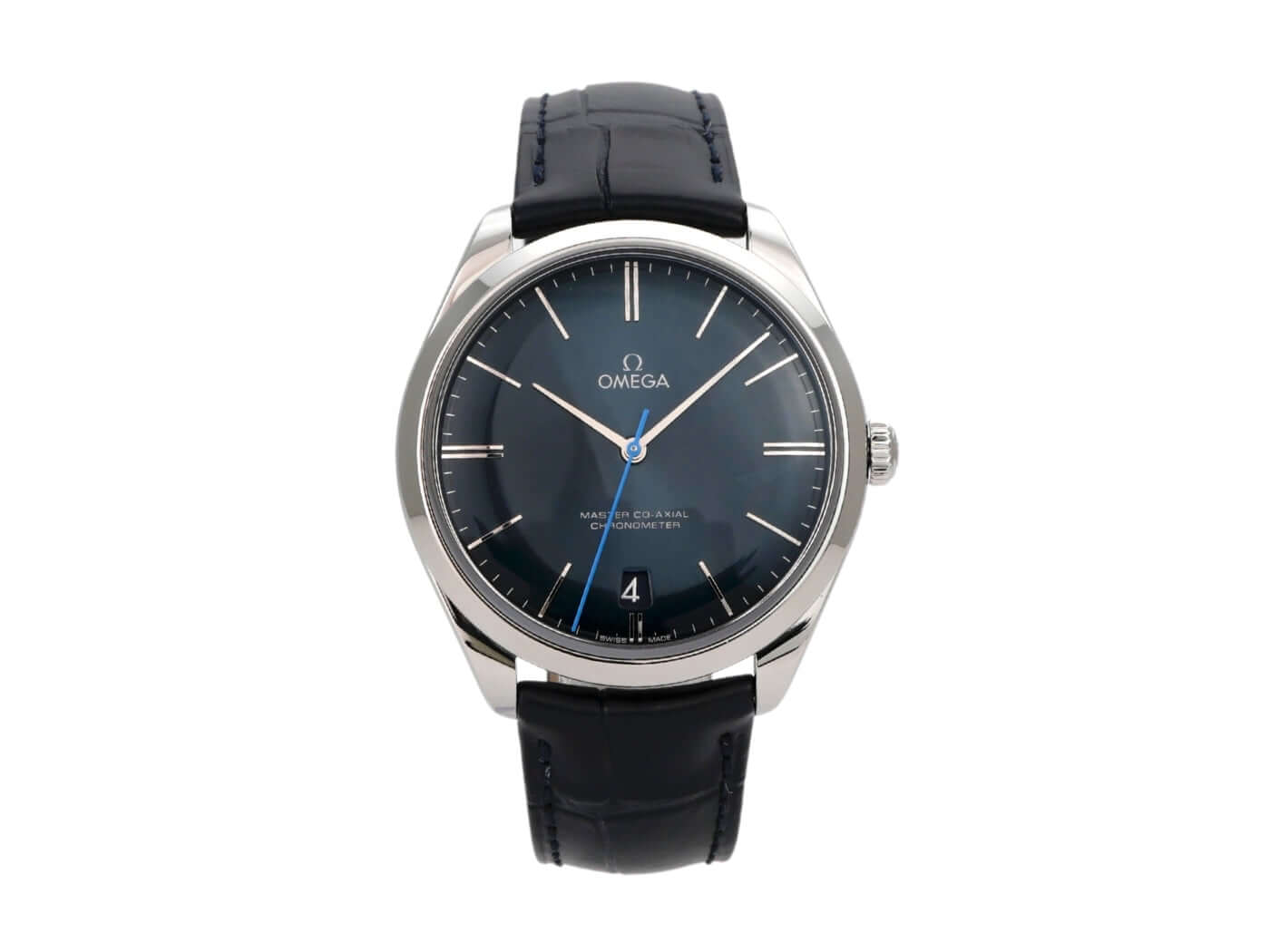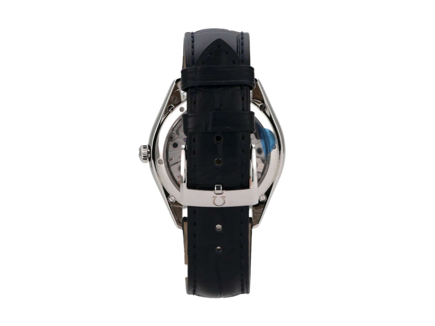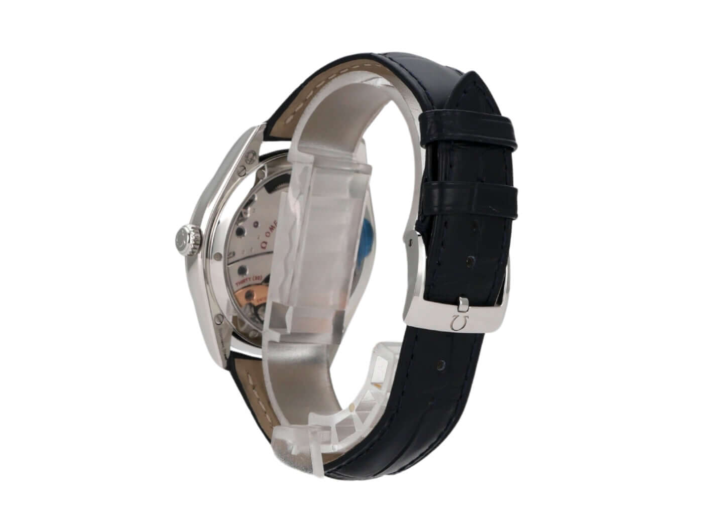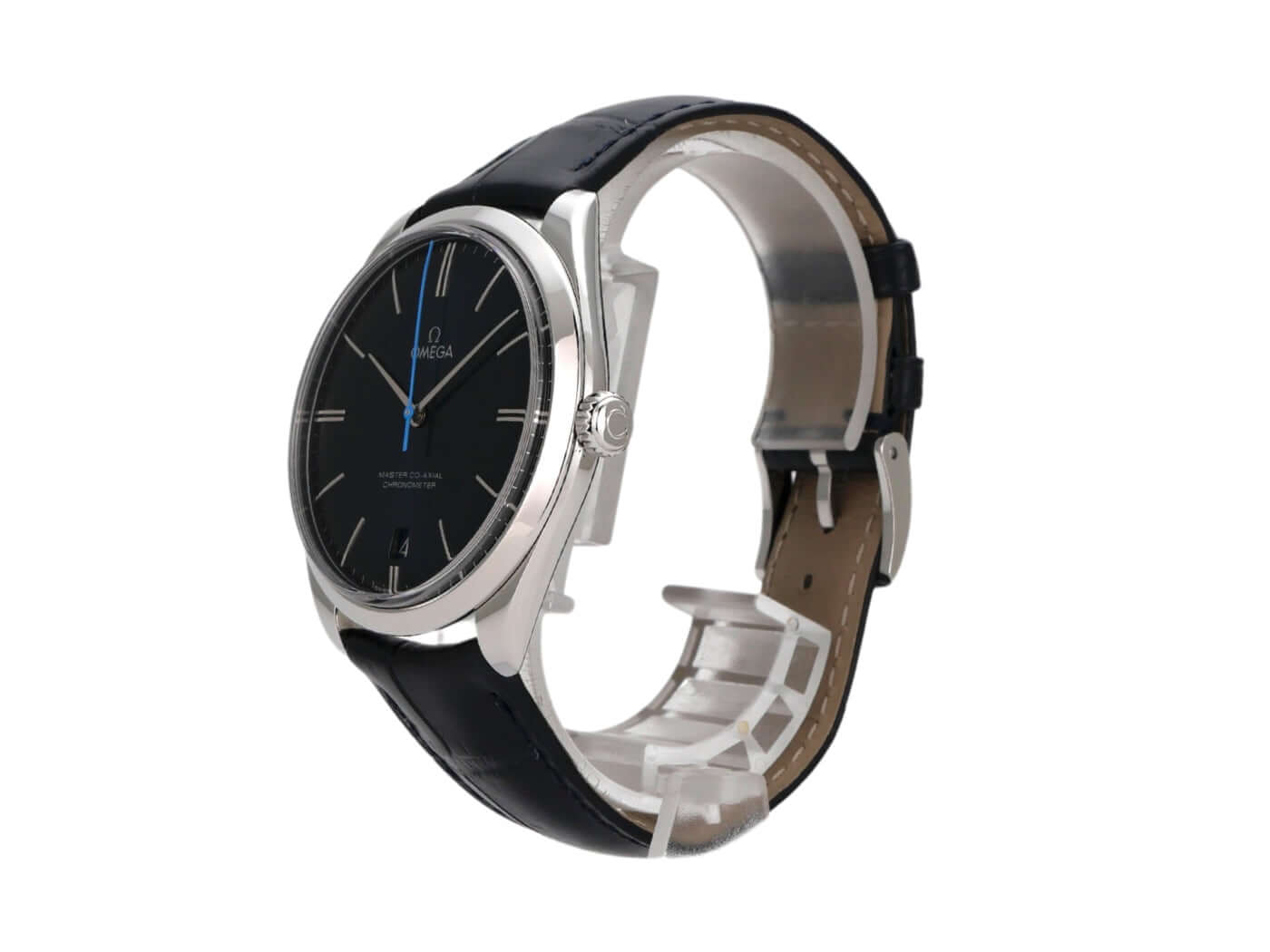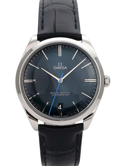 Case made of polished and satin-finished stainless steel, case diameter 40 mm, stainless steel bezel smooth and polished, blue leather strap with pin buckle, blue dial with applied white gold indices, white gold hands, manual winding, anti-magnetic movement that withstands a load of over 15,000 gauss, caliber Omega 8511, Co-Axial escapement, power reserve approx. 60 hours, date display, chronometer, sapphire crystal, sapphire crystal case back, water-resistant up to 3 bar.