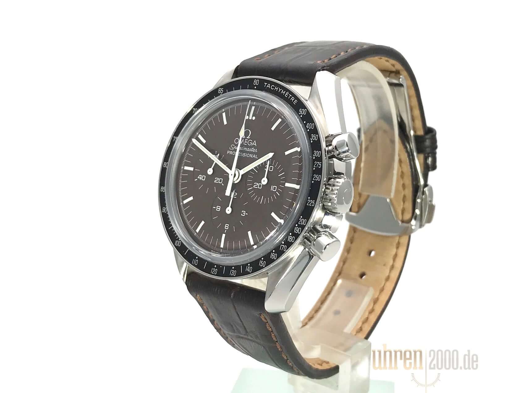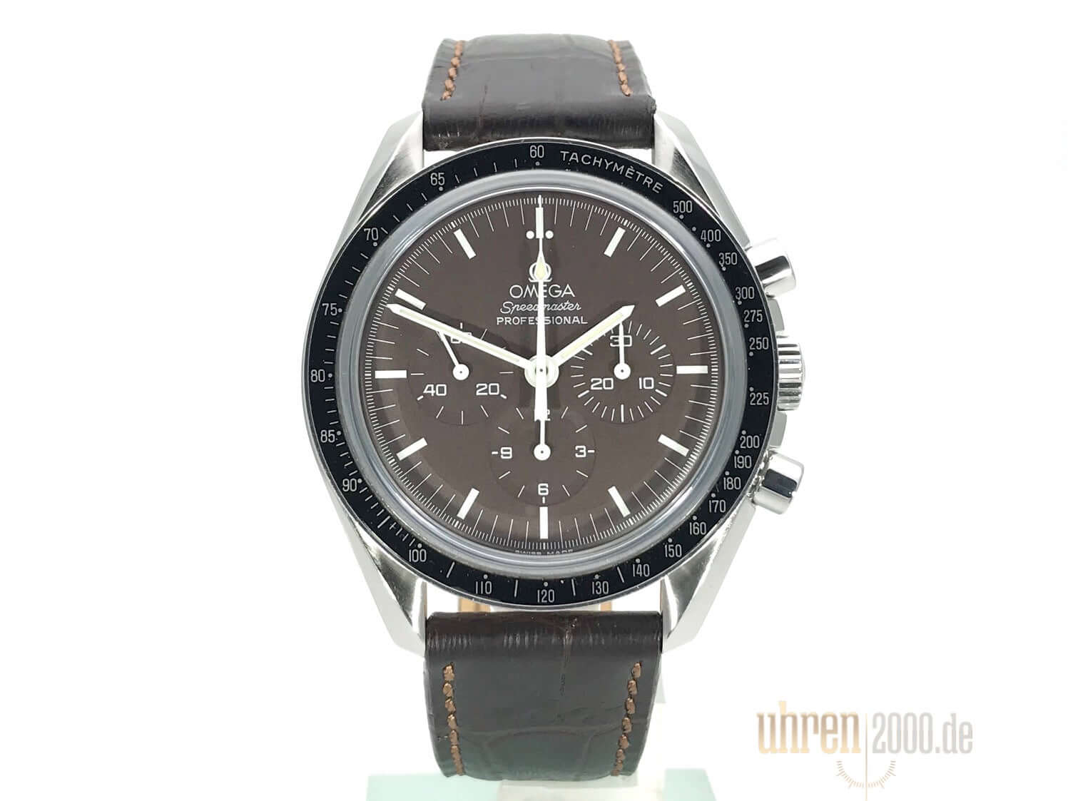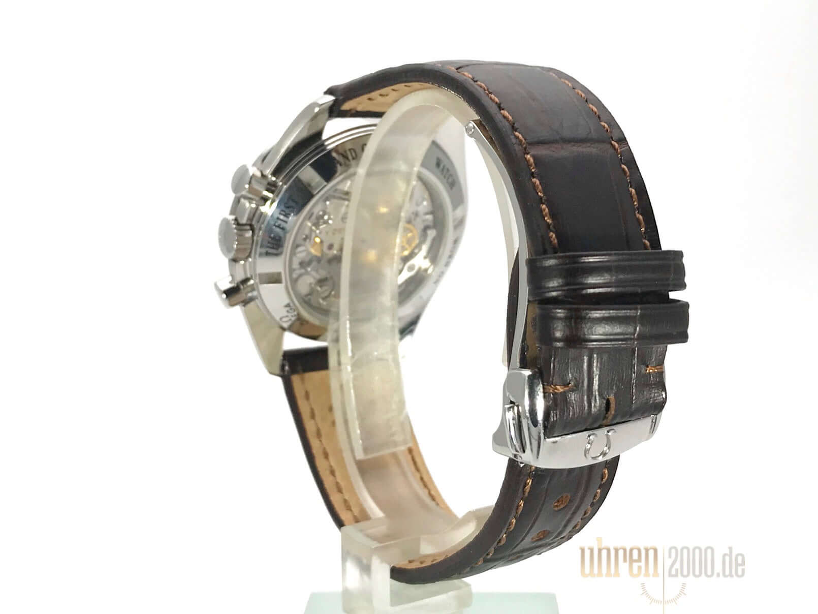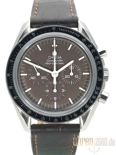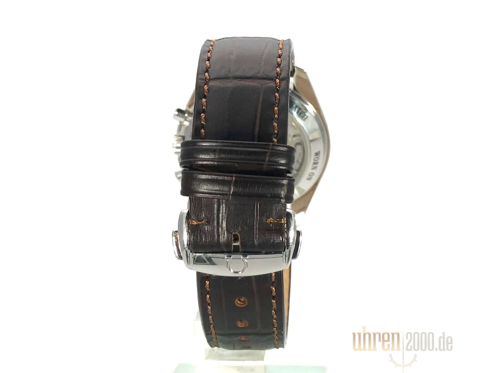 Case made of polished and satin-finished stainless steel, diameter 42 mm, stainless steel bezel, tachymeter bezel in black, brown leather strap with folding clasp, brown dial with line indices, hand-wound movement, Omega caliber 1863, 48-hour power reserve, sapphire crystal, display back, water-resistant up to 5 bar.
