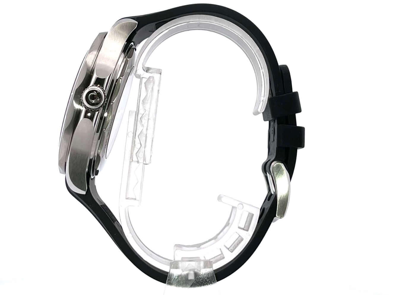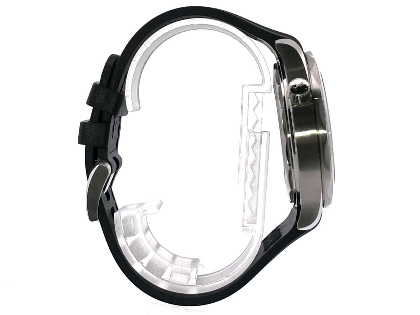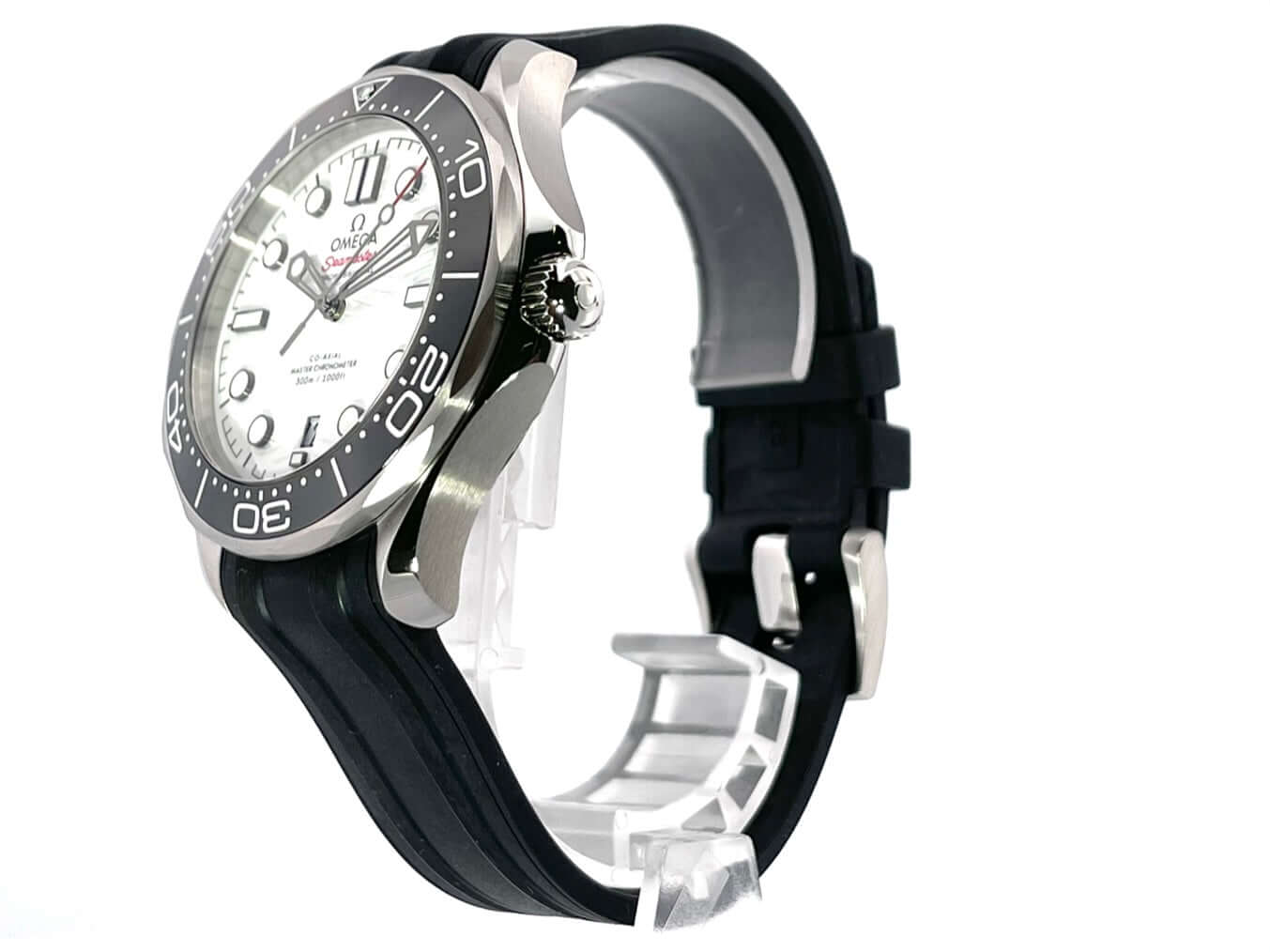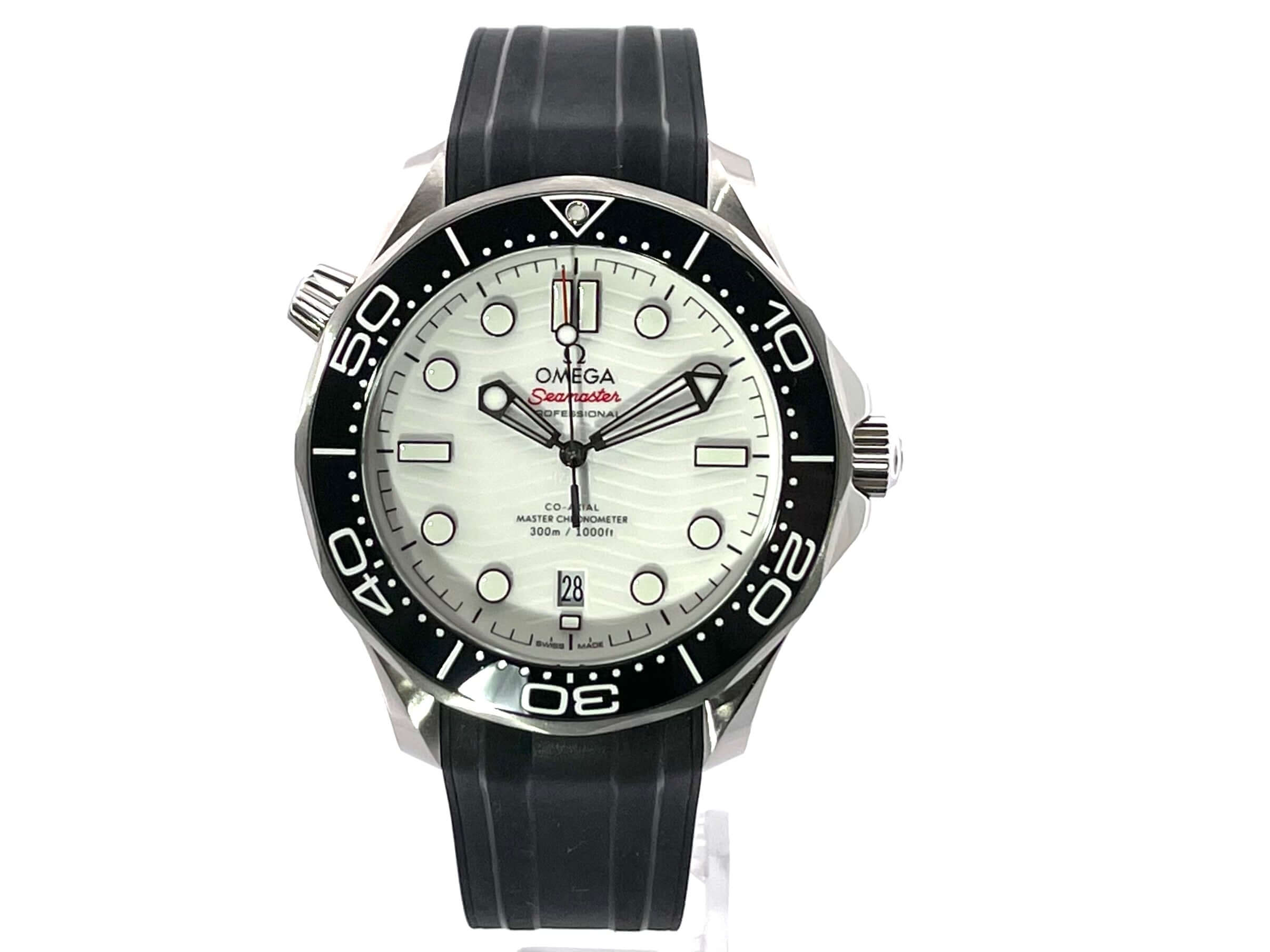 Case made of polished and satined stainless steel, case diameter 42 mm, stainless steel bezel with black ceramic inlay, 60 minute scale and luminous dot, unidirectional rotating, black rubber strap with pin buckle, white dial with applied luminous indices and luminous dots, skeletonized luminous hands, automatic, caliber Omega 8800 with Co- Axial escapement, 35 jewels, 25,200 A/h, power reserve approx. 55 hours, date, chronometer, helium valve, curved and scratch-resistant sapphire crystal, anti-reflective coating on both sides, screw-on crown with side protection, screw-on stainless steel base with viewing window, waterproof up to 30 bar.