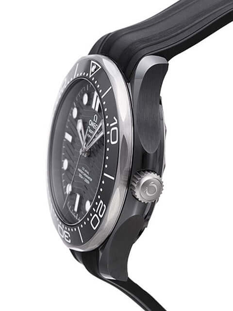 Case made of polished and satin-finished ceramic, case diameter 43.5 mm, titanium bezel with black ceramic inlay, 60 minute scale and luminous dot, unidirectional rotating, black rubber strap with pin buckle, black dial with applied luminous indices and luminous dots, skeletonized luminous hands, automatic movement, caliber Omega 8806 with Co-Axial escapement, 35 jewels, 25,200 A/h, power reserve approx. 55 hours, chronometer, helium valve, curved and scratch-resistant sapphire crystal, anti-reflective coating on both sides, screw-on crown with side protection, screw-on titanium back with viewing window, water-resistant up to 30 bar.