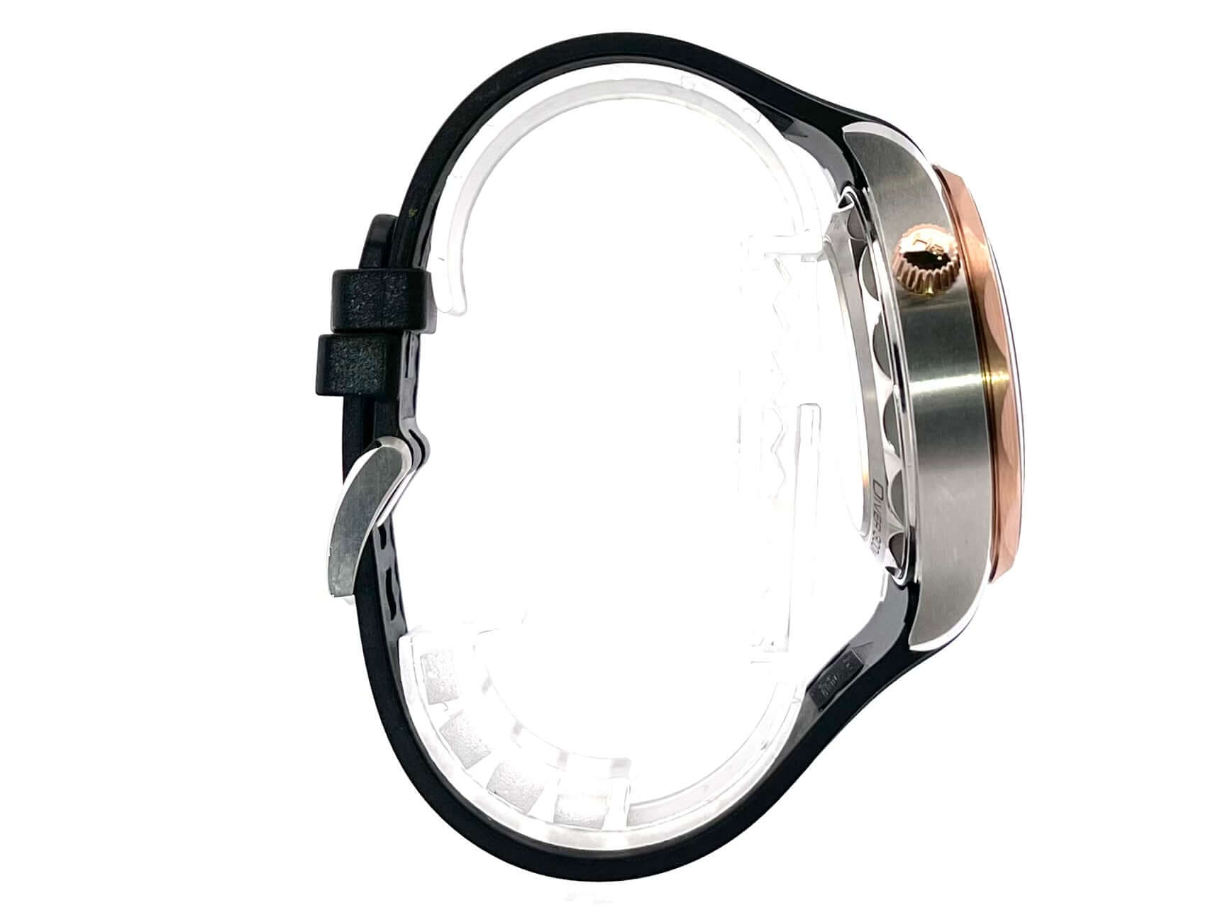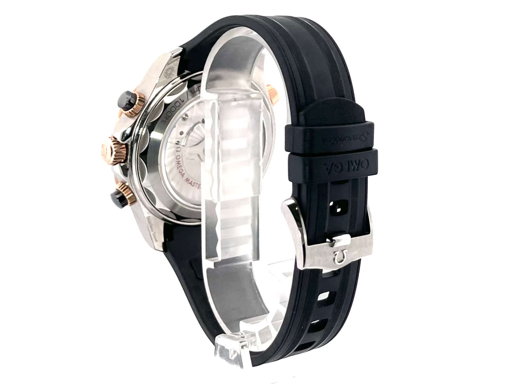 Case made of polished and satin-finished stainless steel, case diameter 44 mm, rotating rose gold bezel with black ceramic inlay, black rubber strap with pin buckle, black dial, rose gold luminous arrow-shaped hands, automatic movement, caliber Omega 9900, 60 hour power reserve, date, small second, master Chronometer, transparent back, water resistant up to 30 bar.