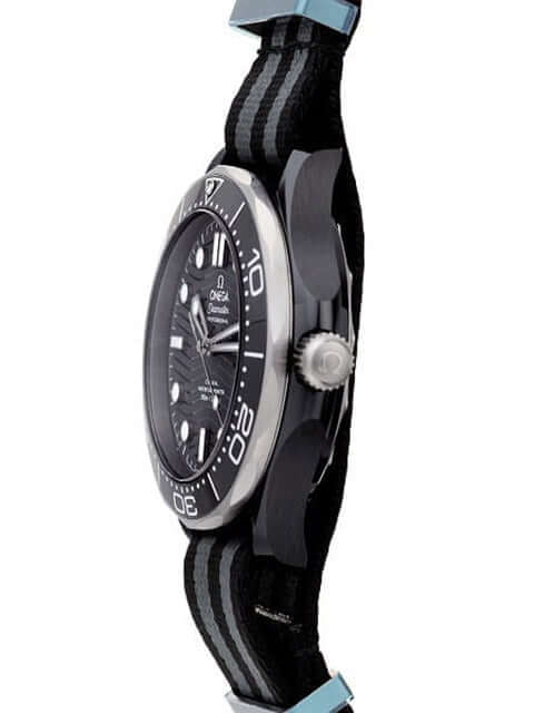 Case made of polished and satin-finished ceramic, case diameter 43.5 mm, titanium bezel with black ceramic inlay, 60 minute scale and luminous dot, unidirectional rotating, black textile strap with pin buckle, black dial with applied luminous indices and luminous dots, skeletonized luminous hands, automatic, caliber Omega 8806 with Co-Axial escapement, 35 jewels, 25,200 A/h, power reserve approx. 55 hours, chronometer, curved and scratch-resistant sapphire crystal, anti-reflective coating on both sides, helium valve, screw-on crown with side protection, screw-on titanium back with viewing window, water-resistant up to 30 bar.